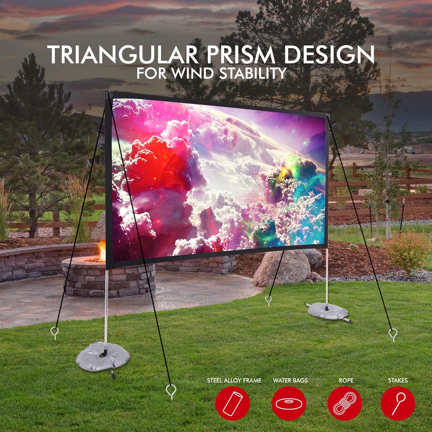 - Designed For Outdoors: The outdoor projector screen with stand comes with water bags, ropes, and stakes to keep the projector screen safely in place even when it gets windy so you can enjoy watching movies and streams during backyard parties, camping, traveling, and more