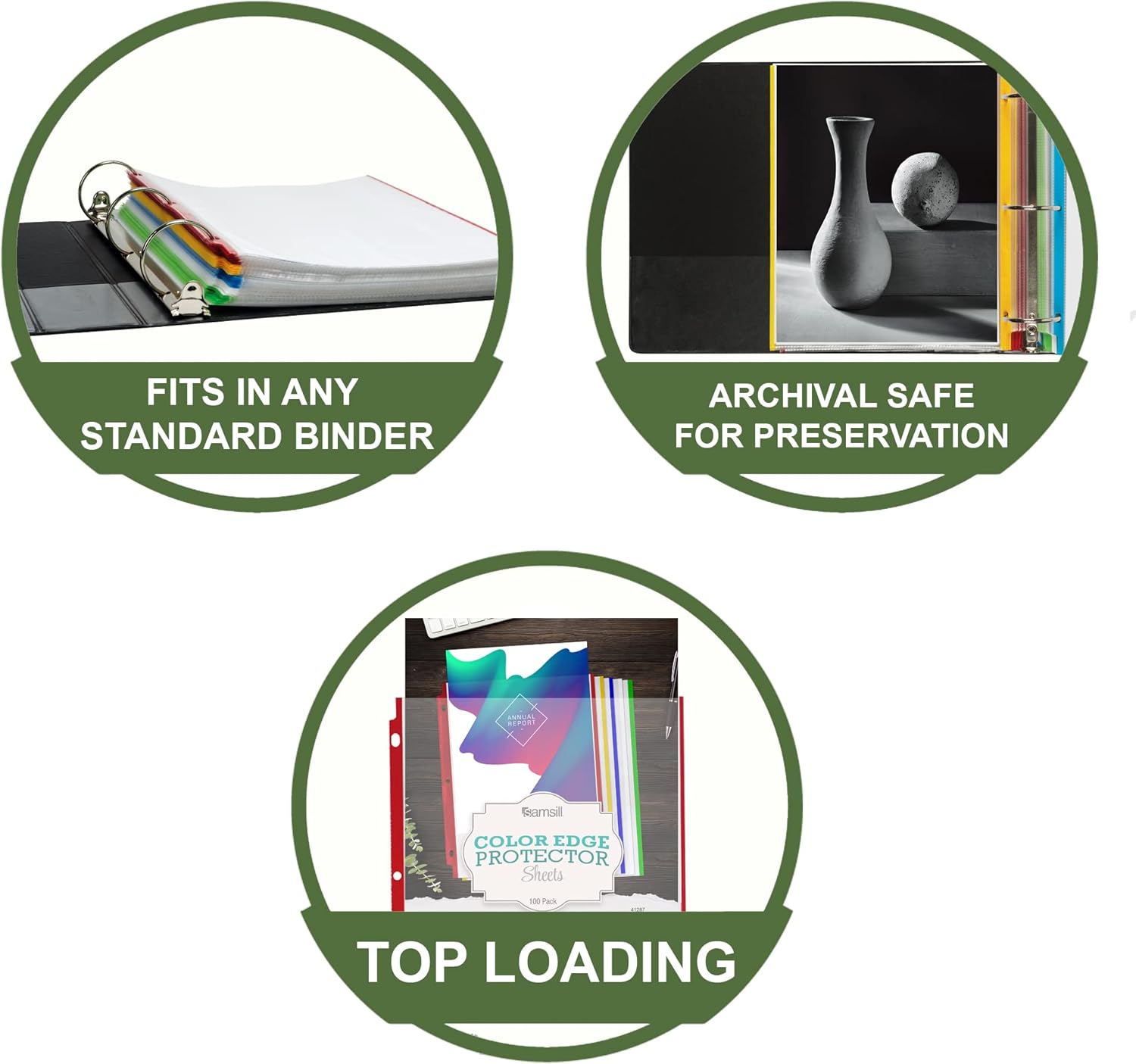 - 100 Pack of Standard Weight Colored Edge Sheet Protectors. Samsill polypropylene document protectors are perfect for standard sized 11 by 8.5 inch paper. Our extra capacity binder sheets can hold 10-12 sheets of paper each, depending on paper thickness