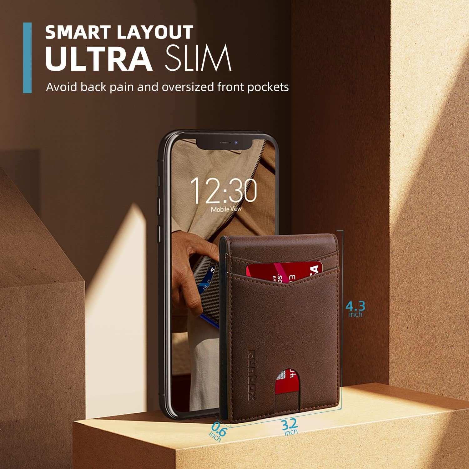 - Slim and thin wallet- This minimalist bifold wallet measures 4.3x3.2x0.6 inches and stores up to 15 cards. The thin wallet perfectly fits in your pocket and is well-suited for everyday carry.