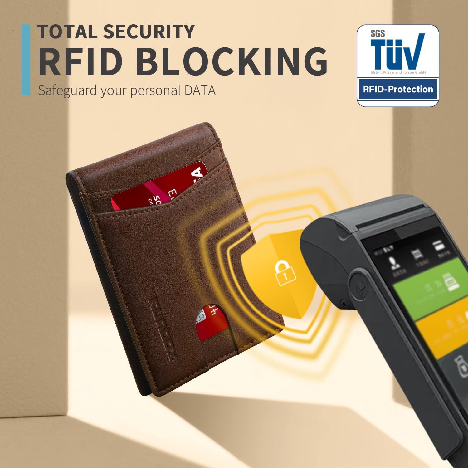 - RFID blocking- Our wallets are equipped with advanced RFID SECURE Technology, a unique metal composite, engineered specifically to block 13.56 MHz or higher RFID signals and protect the valuable information stored on RFID chips from unauthorized scans. License and ID cards will be protected effectively. Blocking the 13.56 MHz band and protect against data theft by RFID scanners.