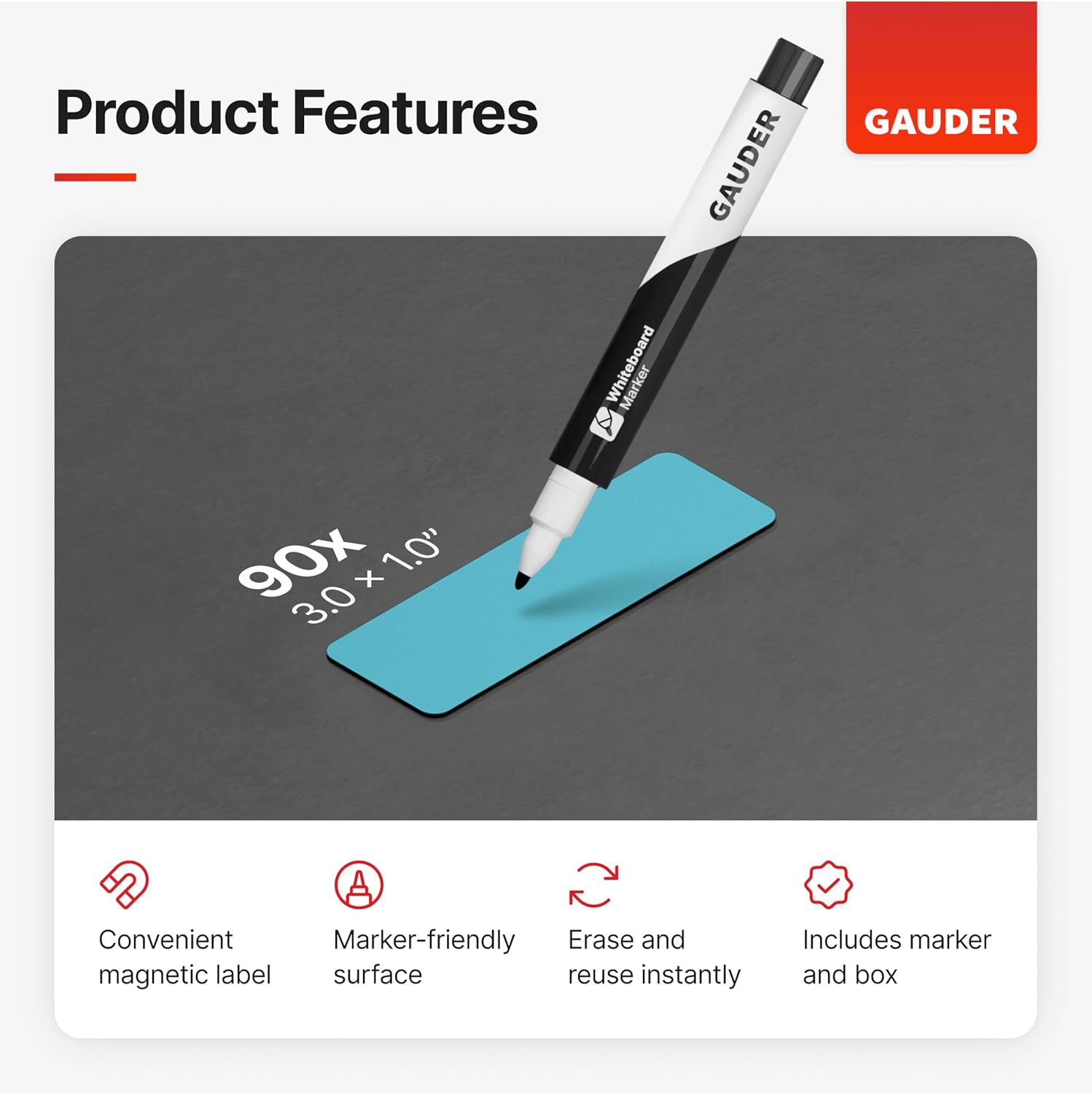GAUDER Magnetic Dry Erase Labels | 90x Magnetic Labels (3 Inches x 1 Inch) | Dry Erase Magnets for Classroom, Whiteboard and Blackboard