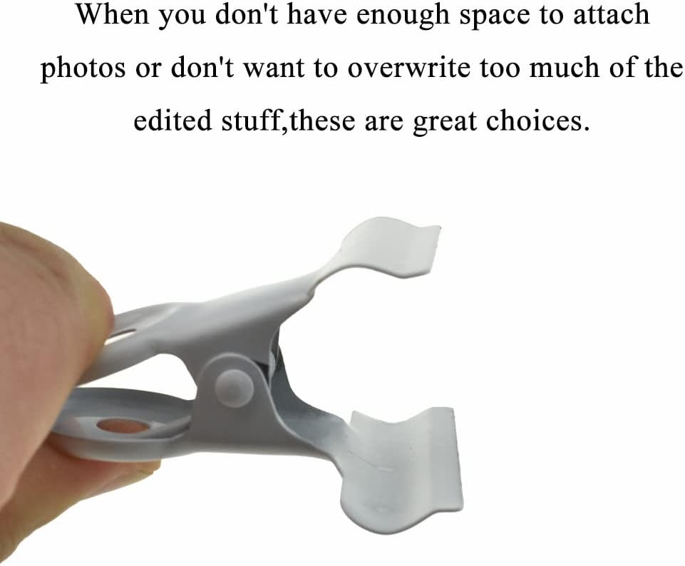 - Save space.When you don't have enough space to attach photos or don't want to overwrite too much of the edited stuff,these are great choices.Apply to hang photos and light weight paper on shutter in office.A small hole in each "handle" area allows plastic ties to keep the clamp securely in the desired sheltered.Also used for hanging up the shower mats to enable easy drying.