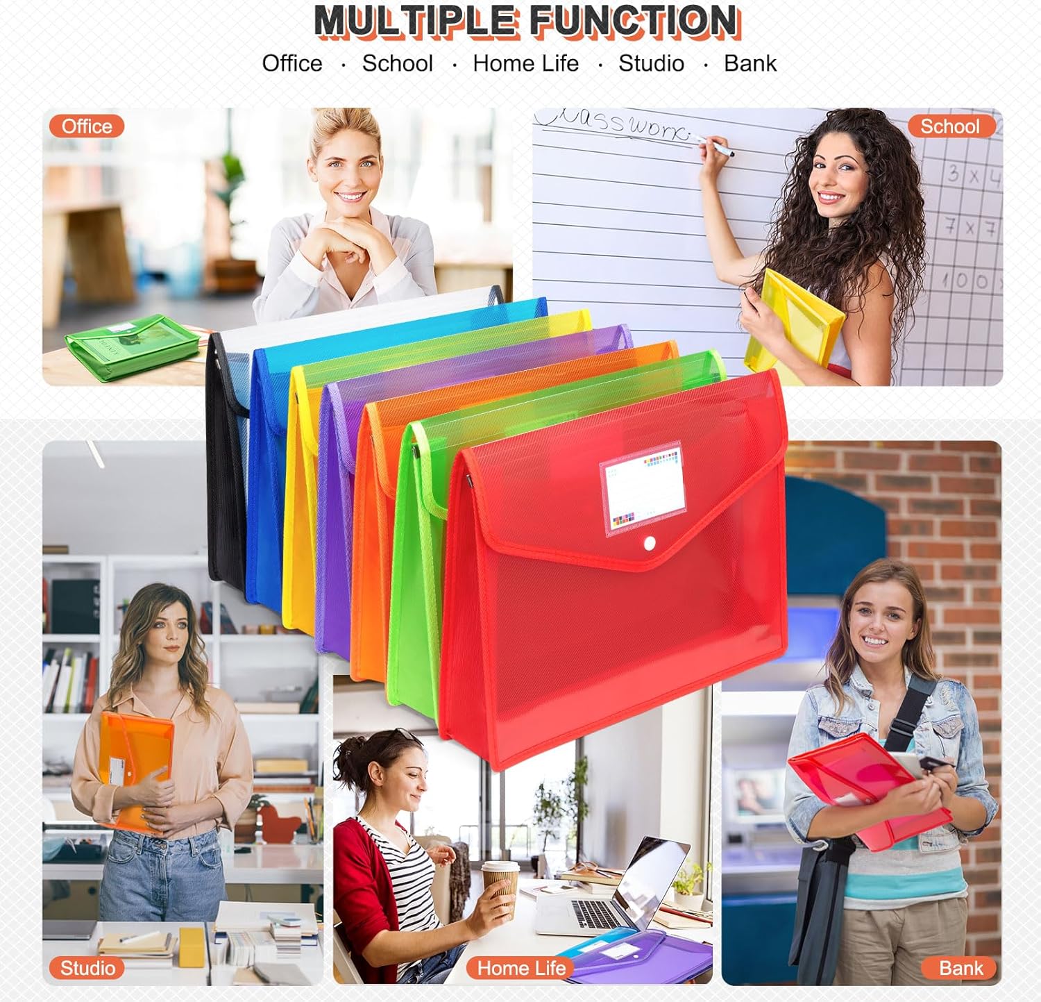 - Unique Design: Cloth over-lock and metal reinforced buckle at both the corners and bottom edge, offers double times service life. The snap button closure ensures your files safe. The expanding pockets feature a card slot, which help you classify your important file. Save your time to find document. Translucent colored envelope keep contents visible, which can help you easily identify document you need. It can stand alone at your shelf due to wide bottom design. keep everything in organized