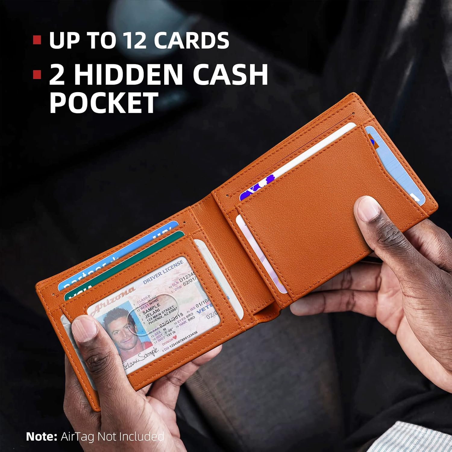 - NO MONEY CLIP DESIGN - Measuring 4" x 3.5", this slim men's wallet boasts a bill compartment that occupies less space than a metal money clip, effectively reducing bulk. It includes 11 card slots, featuring a quick-access slot on the front, 10 slots on the wallet sleeves, and 1 integrated AirTag pocket. (AirTag is not included)