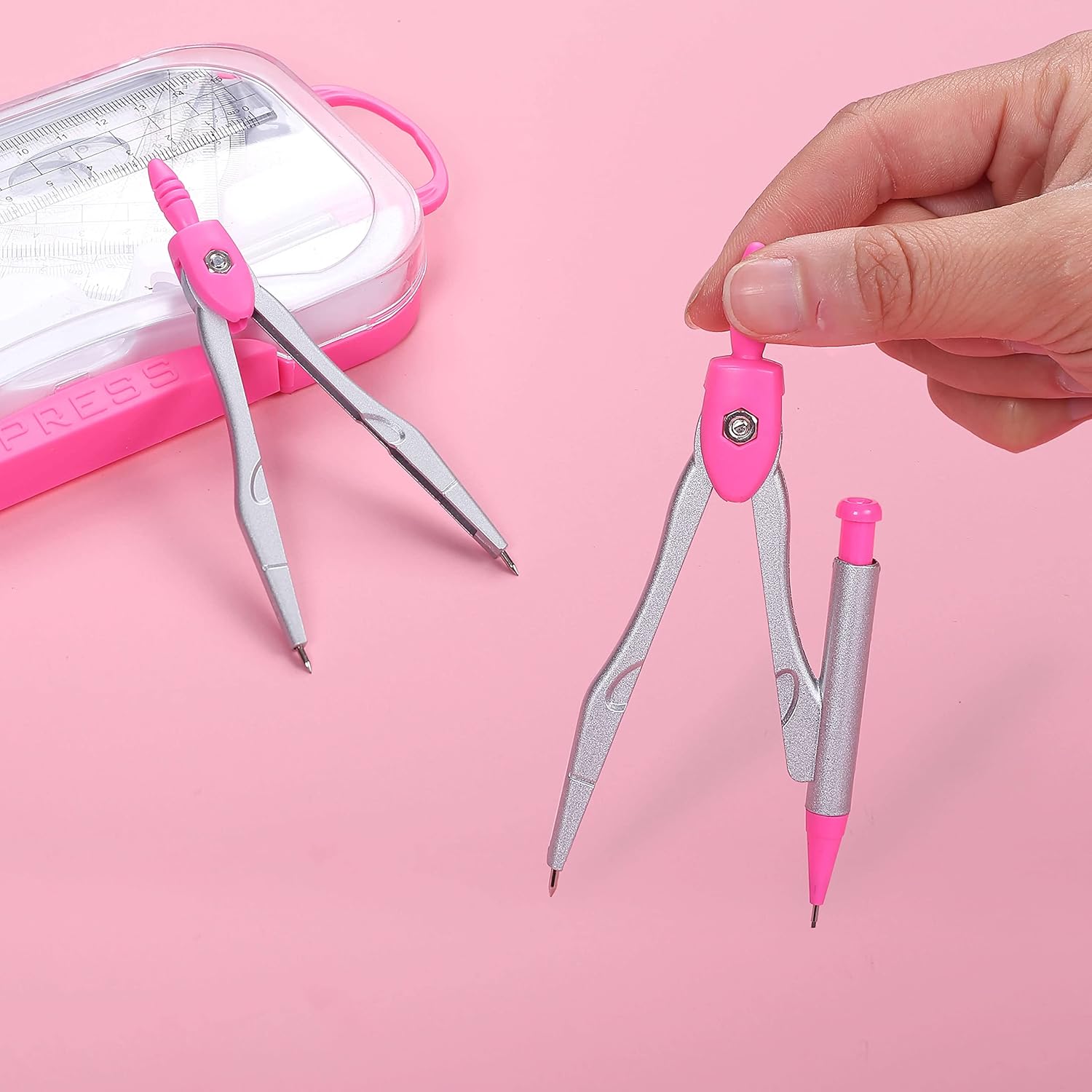 - Complete Geometry Kit: Our 10 Pcs Geometry Set meets all your drafting and drawing needs in one convenient package. Includes a precision compass, two rulers, a protractor, pencil, eraser, sharpener, lead refills, and a durable storage box. Perfect for students of all ages.