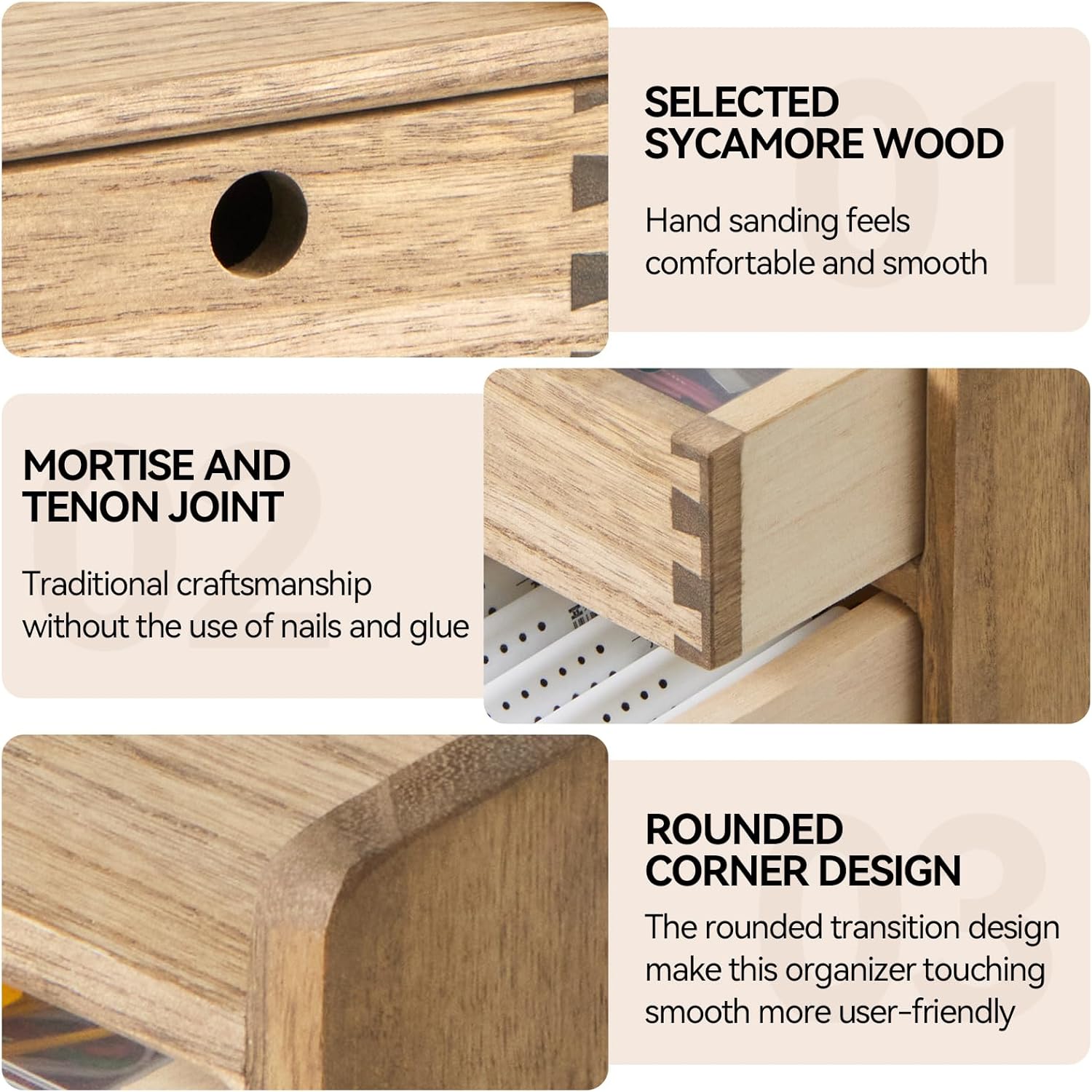 - [EXQUISITE WORKMANSHIP]: The desk organizer is made of selected real wood, the texture is clear and natural, exquisite workmanship,hand polishing.