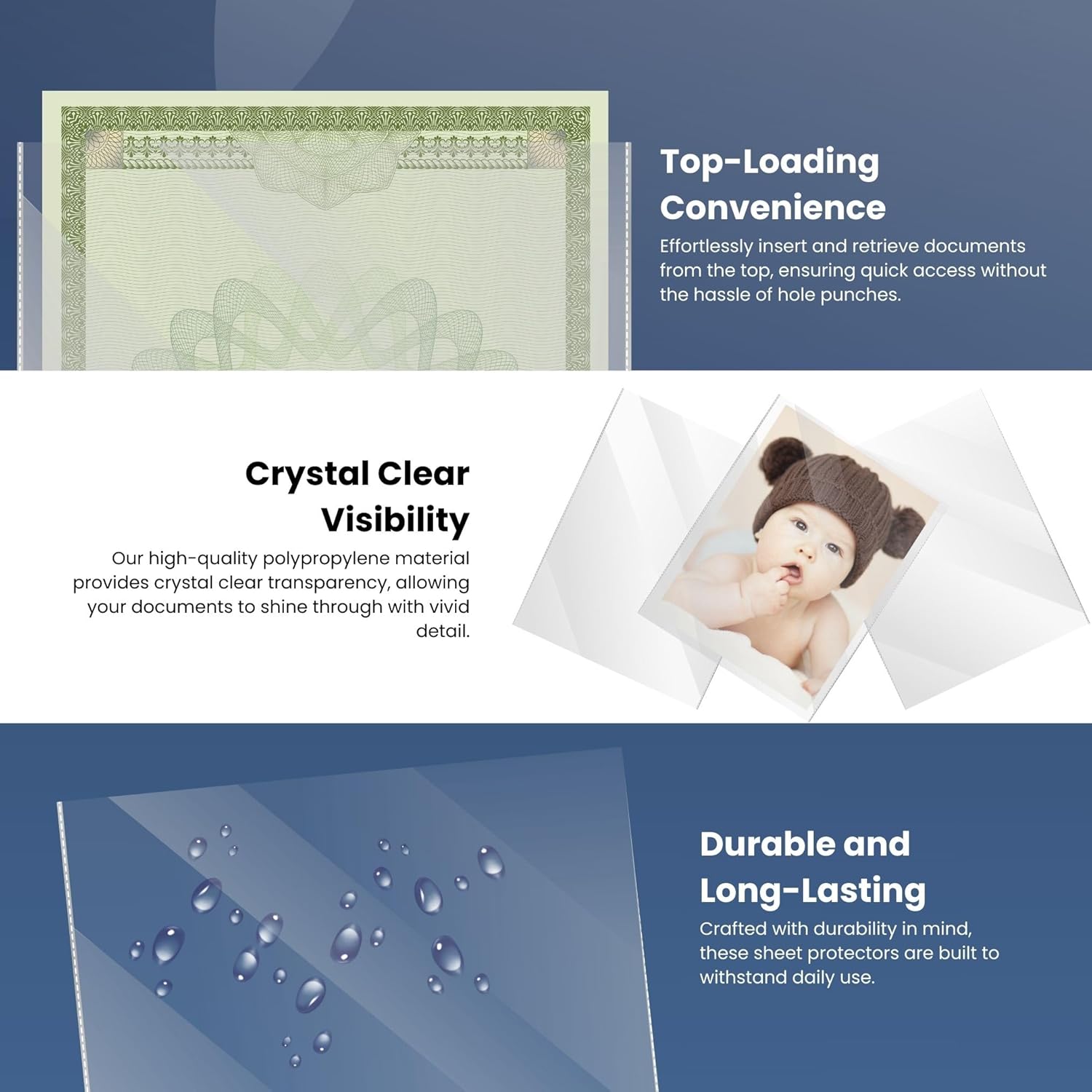 - Crystal Clear Visibility — These top loading sheet protectors have clear finish providing optimum clarity for easy viewing of the documents. Clear page protectors offer complete transparency for easy viewing, at the same time, the slight texture can reduce glare to care for your eyes. Our plastic paper sleeves won't lift or transfer ink and contents are easy to read.
