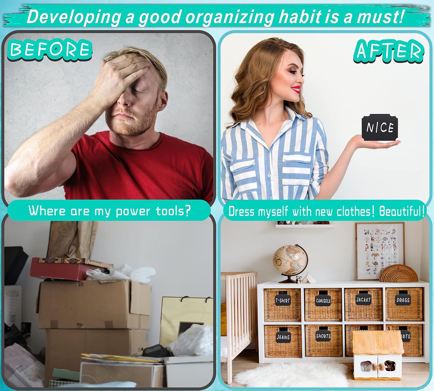 - 【Ideal Gifts For Organization Lovers】- Our storage bin labels will help save time in searching and create more time on other activities people love. We're pretty sure everyone receiving it will be extremely excited like the children getting the candies. It's widely used in kitchen, pantry, bedroom, cloakroom, bathroom, living room, laundry room, storage room, linen closet, cabinets, office, warehouse, super market, game room etc.