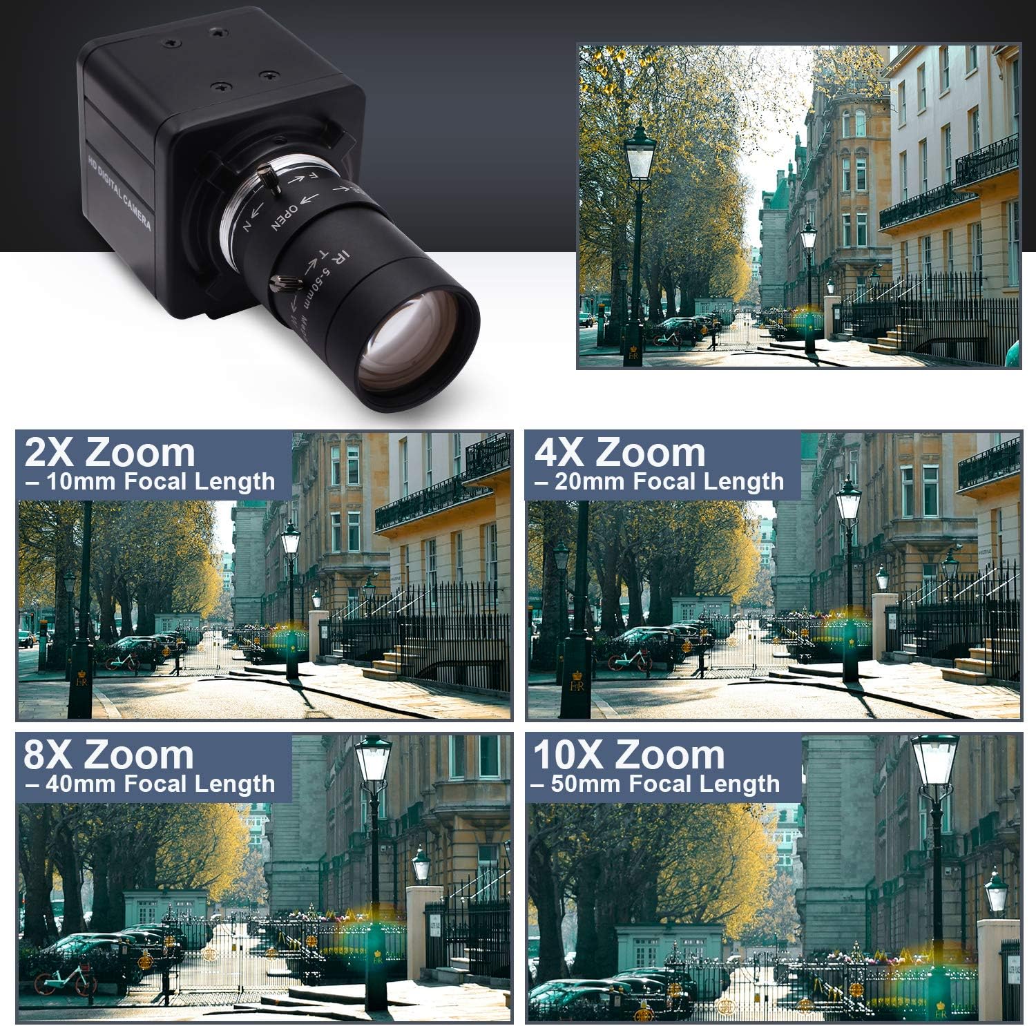- 5-50mm Optical Zoom Manual Lens: HD USB Web camera with CS mount changeable varifocal lens, adjustable focal length,focus,iris for recording distance from centimeters to infinity. You can manually control for close up or make long distance shots