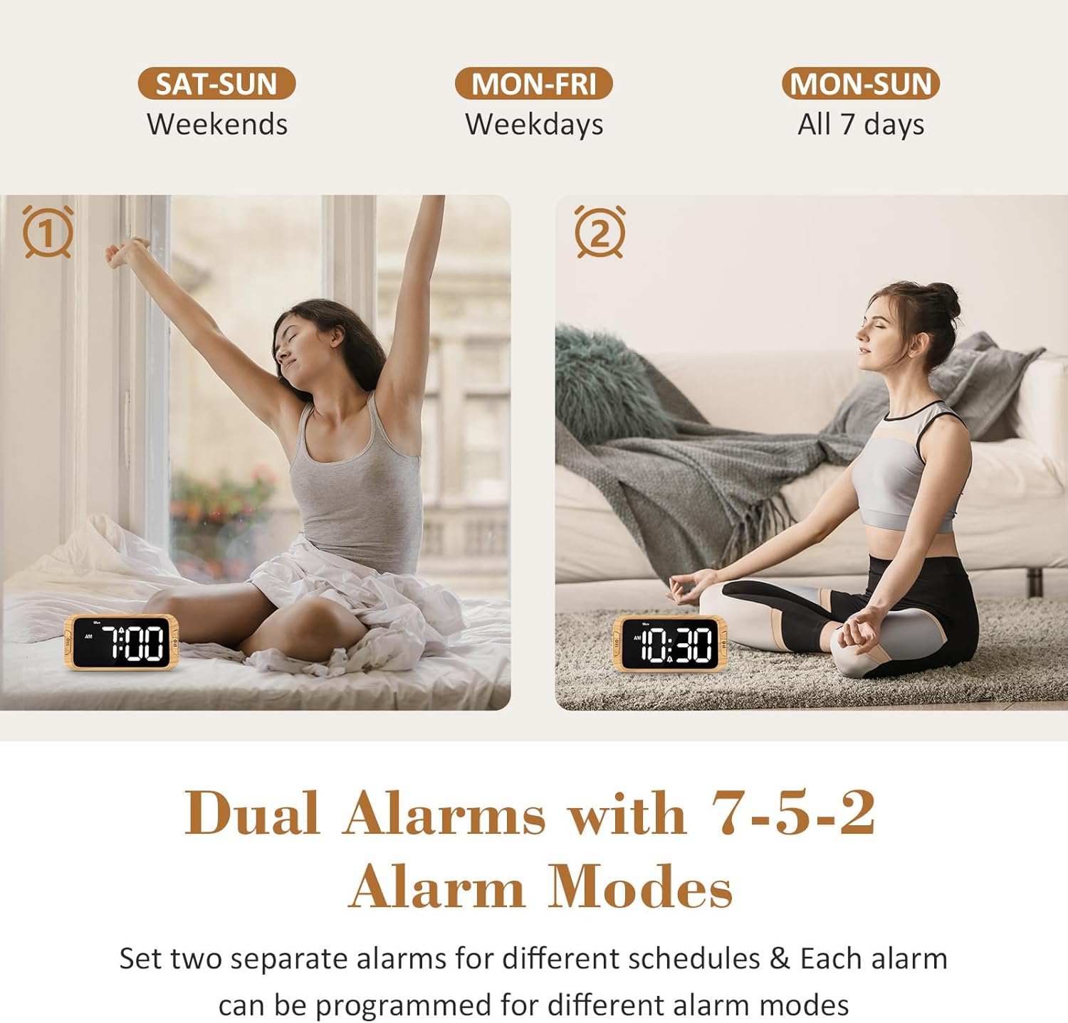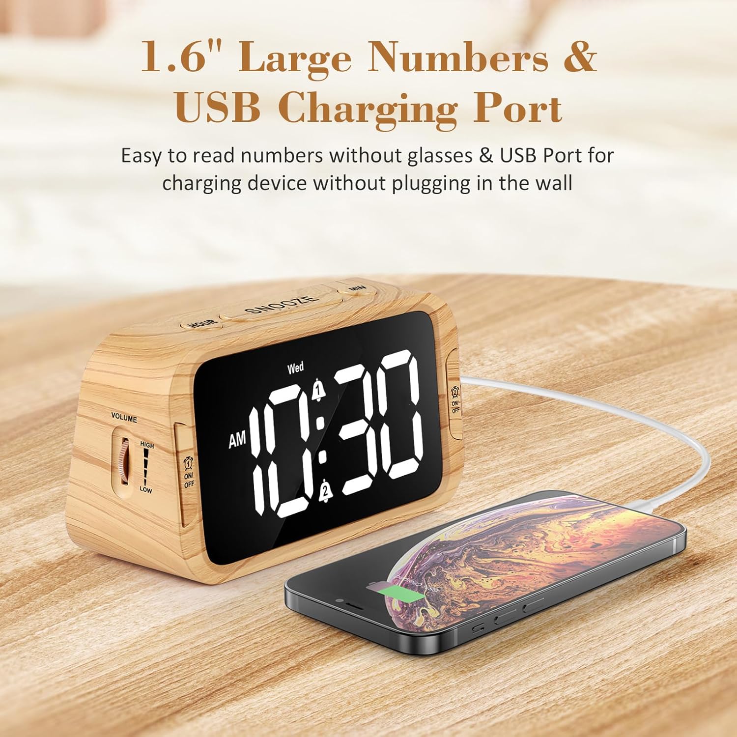 Digital Dual Alarm Clock for Bedroom, 0-100% Dimmer, Weekday/Weekend Mode, Easy to Set, USB Charger, Adjustable Alarm Volume with 5 Alarm Sounds, Snooze, 12/24Hr, Battery Backup (Wood Grain)