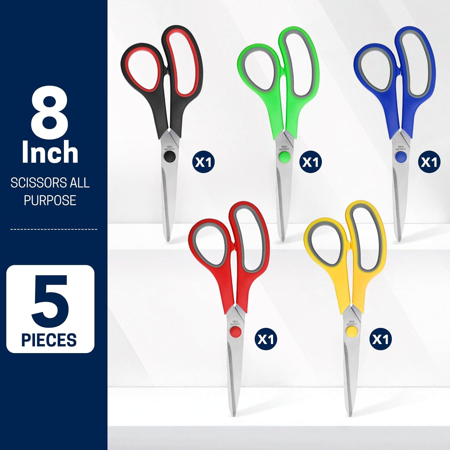 - 8 Inch Scissors:8 Inch Scissors Bulk Set of 5-Pack stainless steel scissors, measures approximately 8 by 3 inches. Yellow, green, blue, red and black color are included.