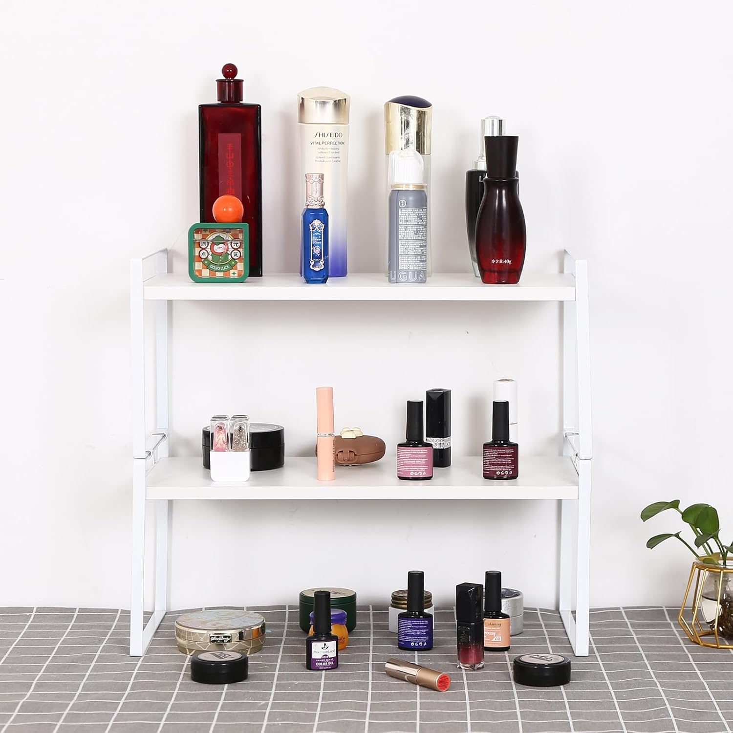 YGYQZ Wood Office Desk Shelf Organizer - Desktop Supplies Cute Dresser Top Organization Storage Rack and Cubicle Decor Aesthetic Bookshelf for Women Man and Kids (White White-Two Tier)