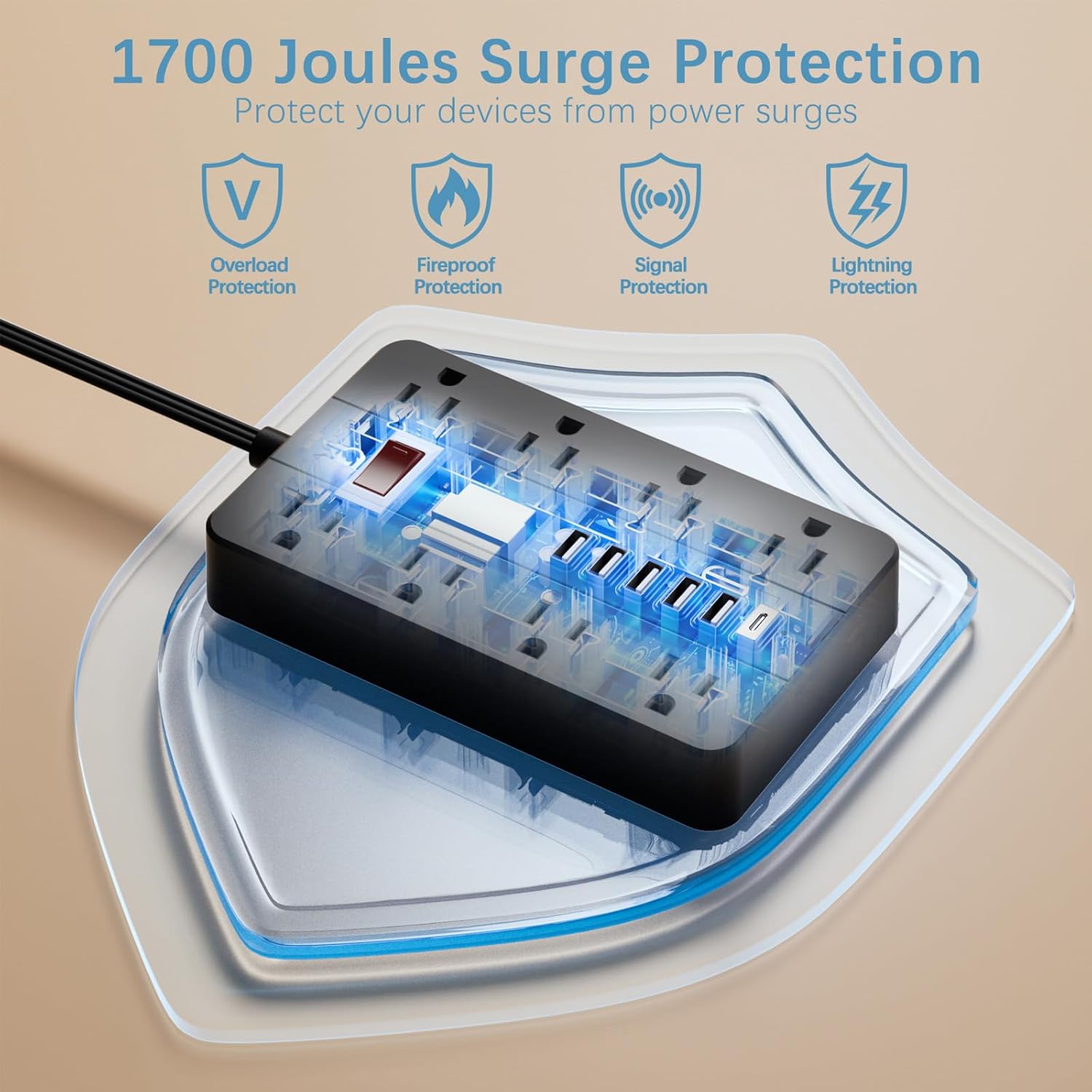- Multi Outlets Widely Spaced Power Strip: power strip surge protector with 8AC widely outlets and 6 USB charging ports, can power up to 14 devices simultaneously; You can use it in any indoor place such as home, office and dorm room