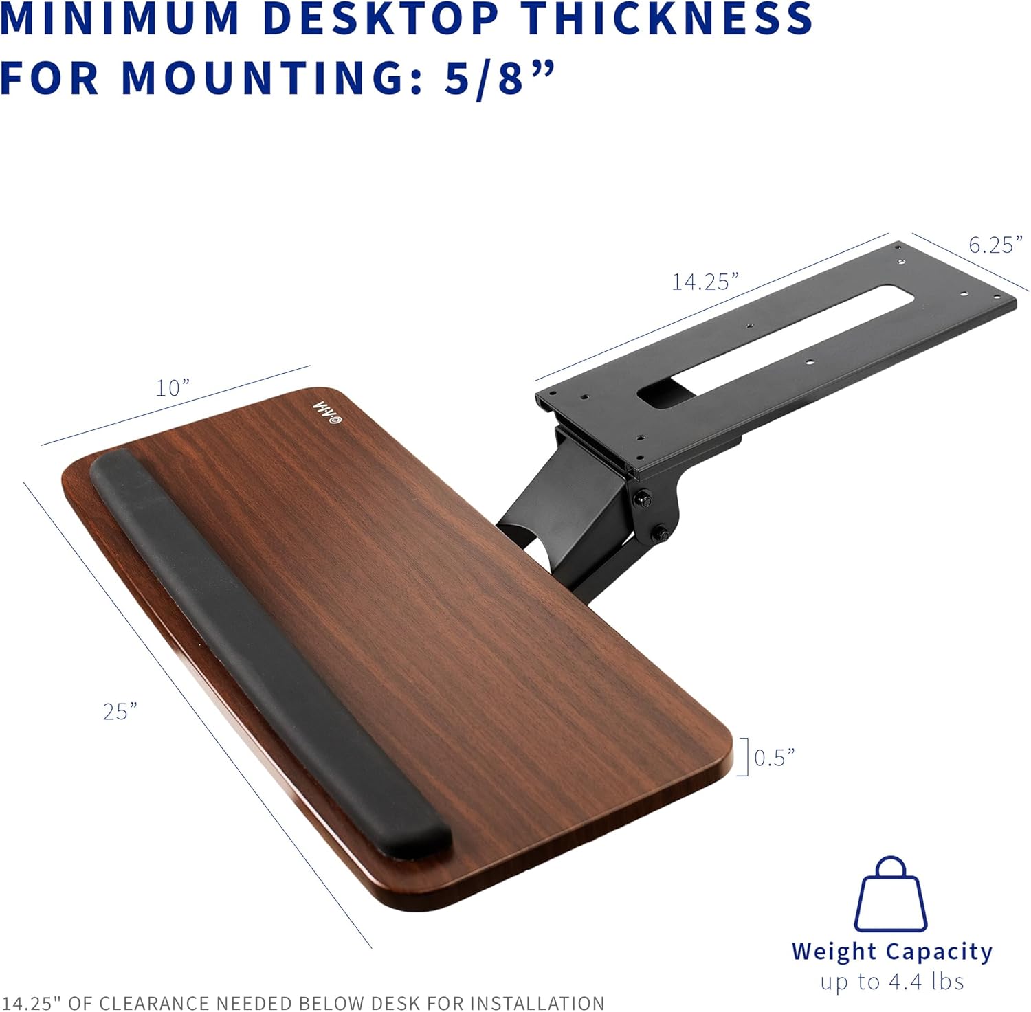 - Ergonomic Keyboard and Mouse Tray - Installs underneath a standard desk for comfortable typing angles. Please Note: If installing to a height adjustable desk, you will need a spacer bracket for the track to fit over the frame crossbar. VIVO offers adapter MOUNT-SPACER01 (not included) for this purpose.