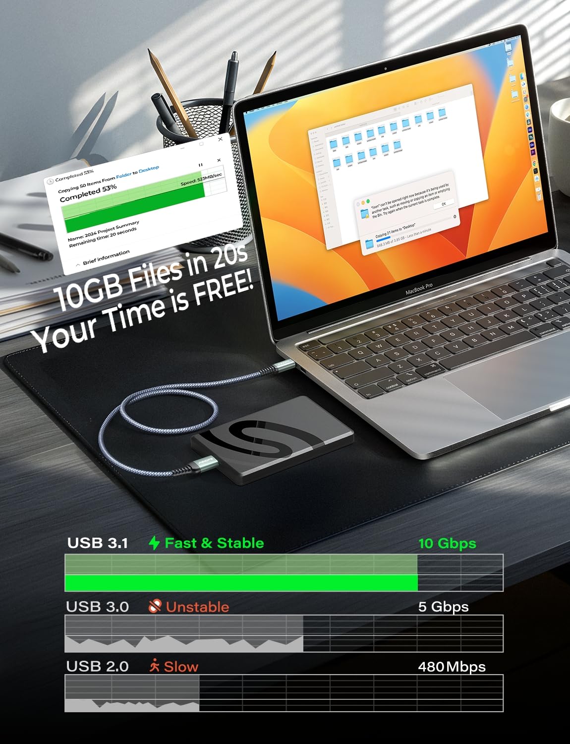 - 【10Gbps Ultra-Speed Data Transfer】Engineered for ultimate efficiency, this USB C to Micro B Seagate External Hard Drive Cord delivers blazing-fast 10Gbps data transfer – 10x faster than USB 3.0 and 20x faster than USB 2.0. Transfer a 10GB HD movie in just 20 seconds, ideal for photographers handling 4K RAW files, professionals managing massive backups, or gamers who need an external hard drive to expand storage, ect.