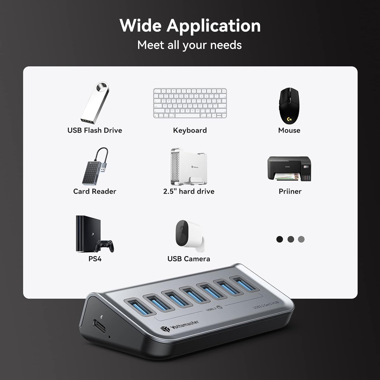 Yottamaster 7 Port USB 3.0 Hub, Data USB Hub Splitter with 3.2ft Cable Compatible with MacBook, Mac Pro, Compatible with Mac Mini, iMac, Laptop, PC, USB Flash Drives, Mobile HDD, Printer (3.2ft)