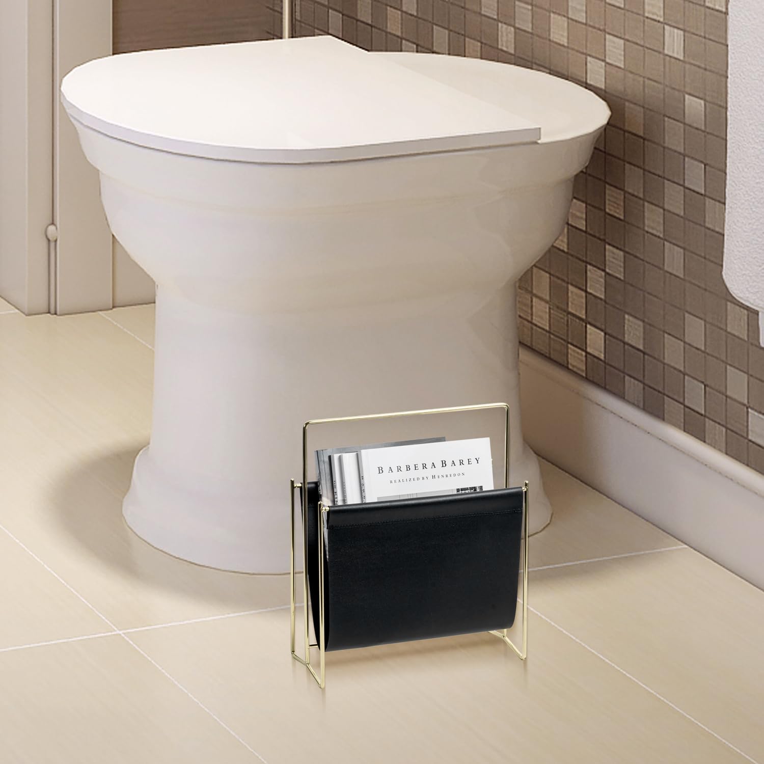 MyGift 13 Inch Modern Black Leatherette Magazine Holder Floor Standing Sling Style Rack with Gold Tone Metal Frame