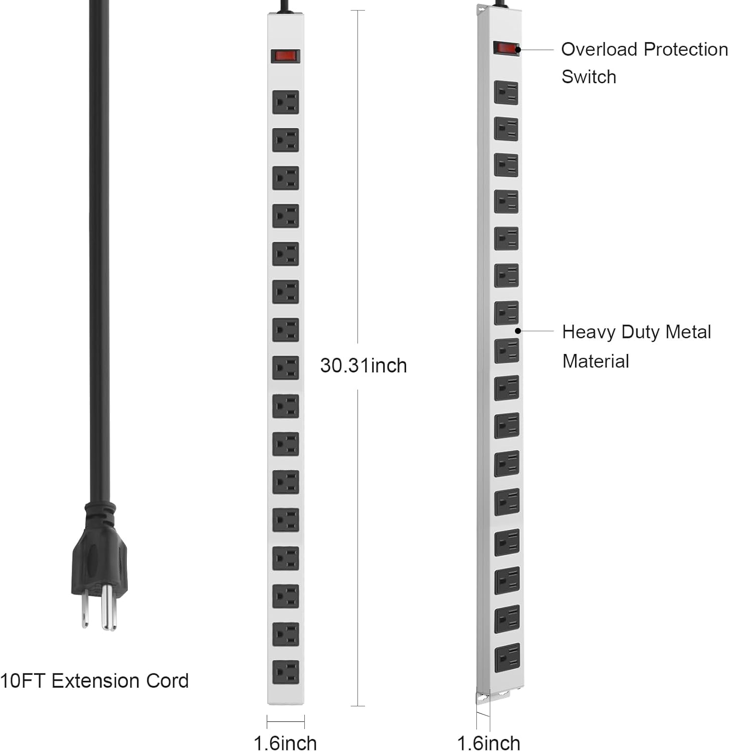 - Metal Power Strip Surge Protector: With overload protection, the reliable overload switch will trip off automatically to protect your devices when over-voltage, over-current, overload, high-temperature, short-circuiting.