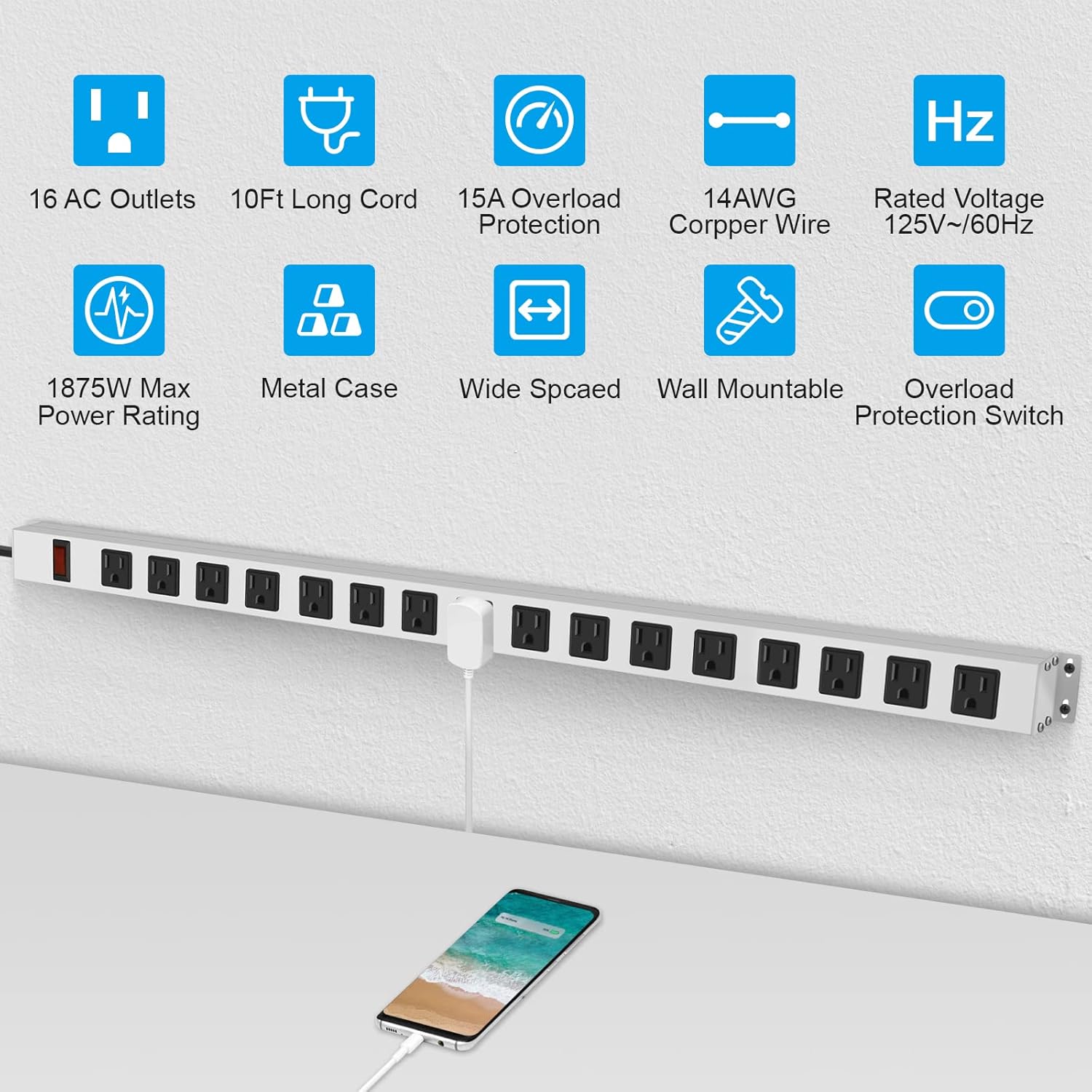 - Long Power Strip 16 Outlet: Providing enough space between the sockets to accommodate big plugs. heavy duty surge protector was connected with 10ft 14AWG/3C power cord, Equipped with 15A high current, Max: 60Hz/125V/15Amp/1875W.