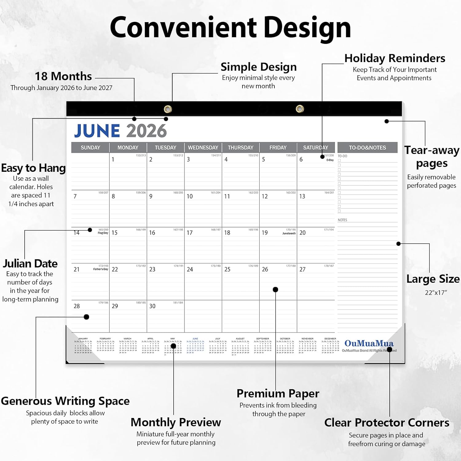 OuMuaMua Large Desk Calendar 2026-2027 - 18 Months from Jan. 2026 through Jun. 2027, 22 x 17 Inches Desktop Wall Calendar with Julian Date To-do & Notes, Corner Protectors for School Home Office