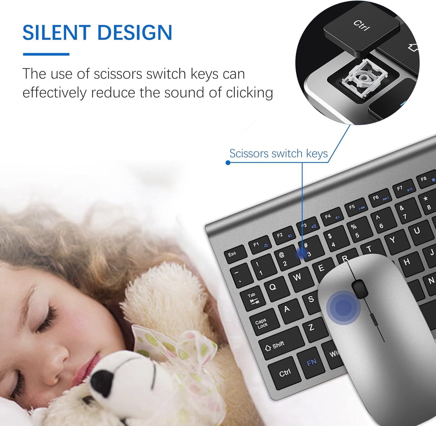 - 【Ultra-Slim and Portable Design】Wireless pc keyboard has 14.55x5.5x0.8in(37*14*2cm), 0.8in(2cm) ultra-thin ABS plastic body, which can save space and easy to carry. Kit keyboard and mouse wireless’s sleek design is super match with office desk. Perfect for business travel, office, home, library and many public occasions.