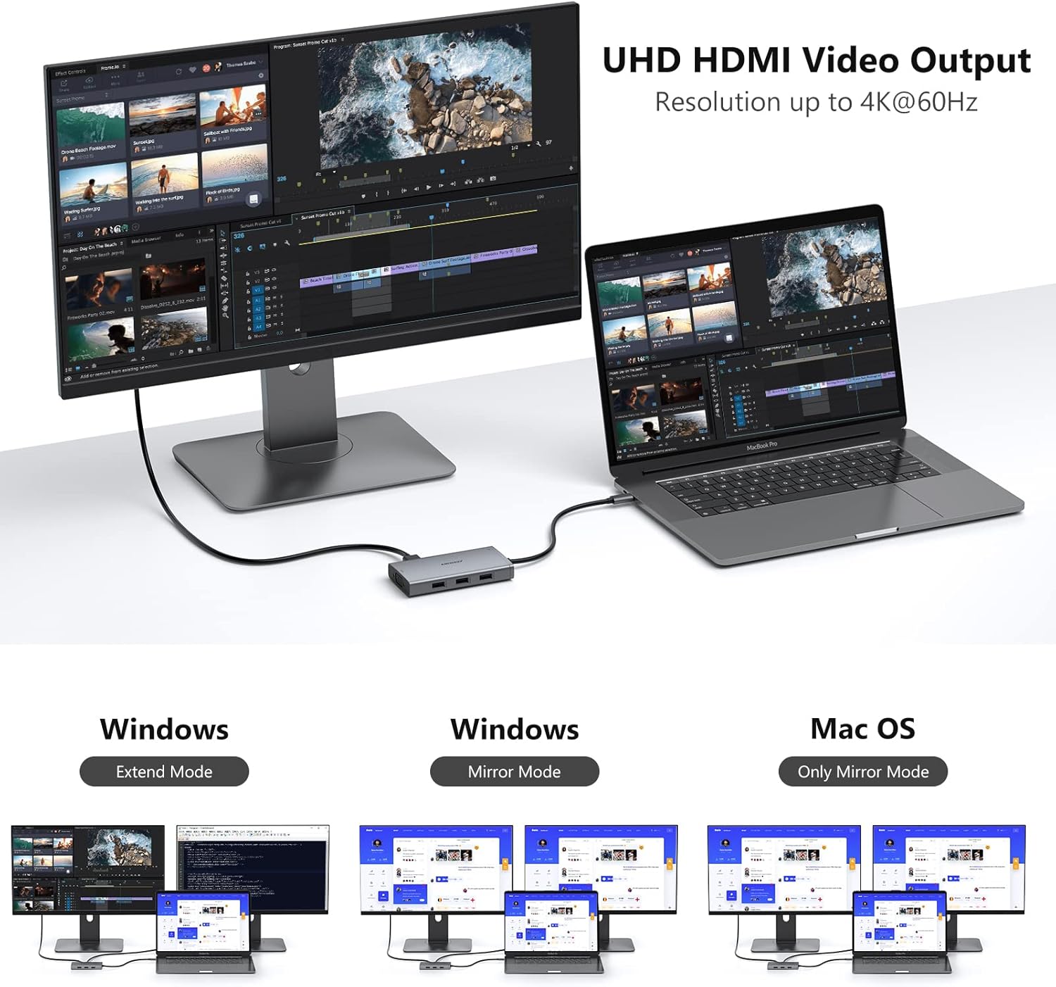 - Dual 4k Resolution Output: HDMI1/DP max up to 4K@60Hz, HDMI2 up to 4K@30Hz(work separately while source is DP1.4). When dual displays, HDMI1 or DP will be 4K@60Hz and HDMI2 up to 4K@59Hz(DP1.4). When using 2 hdmi+DP, HDMI1 up to 4K@59Hz, DP up to 4K@29Hz, HDMI2 up to 2K@60Hz(DP1.4).Display output will be 1080P when multiple monitor with VGA. Note!!! When using daul hdmi+DP, must follow the sequence or it will fail: Plug in HDMI1→Plug in DP(wait for the screen to display successfully)→Plug in HDMI2