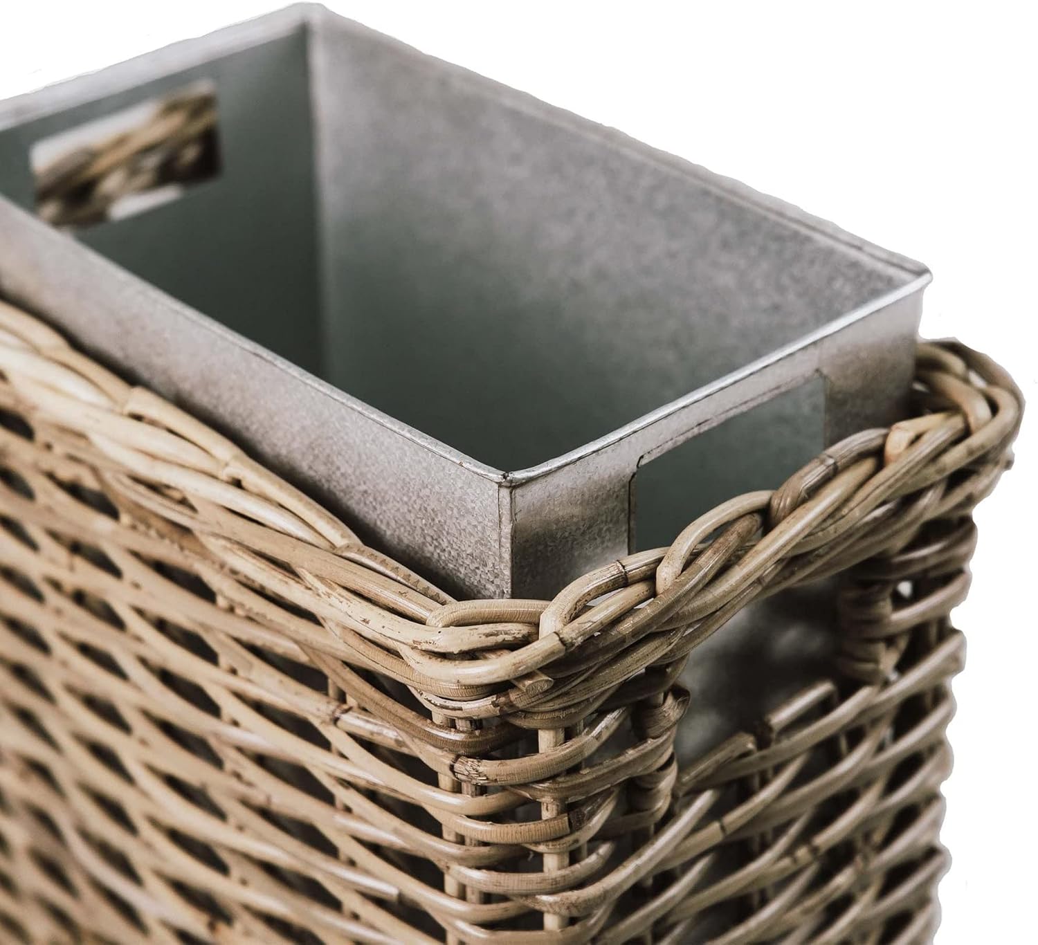 The Basket Lady Large Rectangular Kubu Wicker Waste Basket with Metal Liner, 14.5 in L x 9 in W x 18 in H, Serene Grey