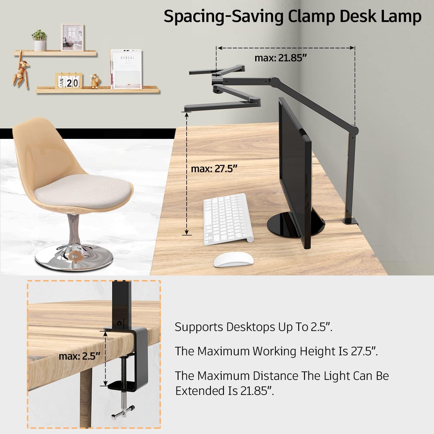 - 【Wider Lighting Range】: Epabina clamp desk lamp can be extended up to 41.5 inches long and lights up an extensive 95 inches range without dark areas, wide enough to adequately illuminate your entire workbench evenly. The maximum 27.5 inches working height is tall enough for multi-task, it reaches over the screens with no issues. The tall desk lamp is perfect for L-shaped desk with multiple monitors, large workstation with a curved screen.