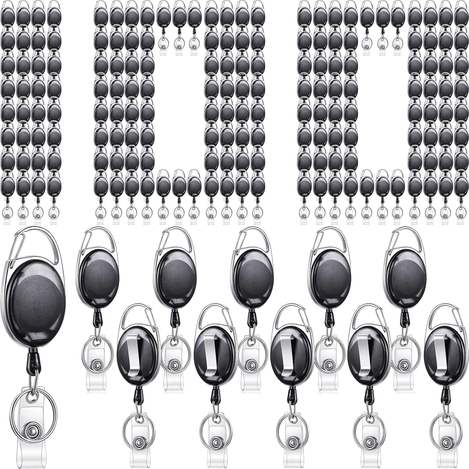 Maitys 100 Pack Retractable Badge Reels Bulk Heavy Duty Badge Reel Holders with Carabiner Belt Clip and Keychain for Lanyard Card Nurse School Office Employee (Clear Black)