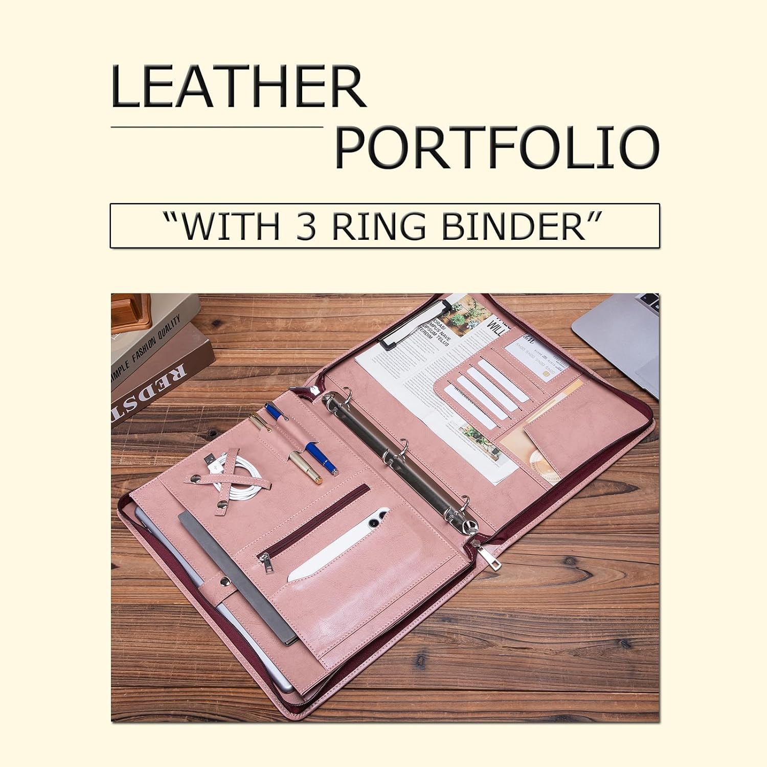 Personalized Vegan Leather Portfolio 3 Ring Binder with Clipboard, Hidden Handle, Custom 8.5 x 11 Zip Padfolio, Business Professional Organizer for Women, Pink