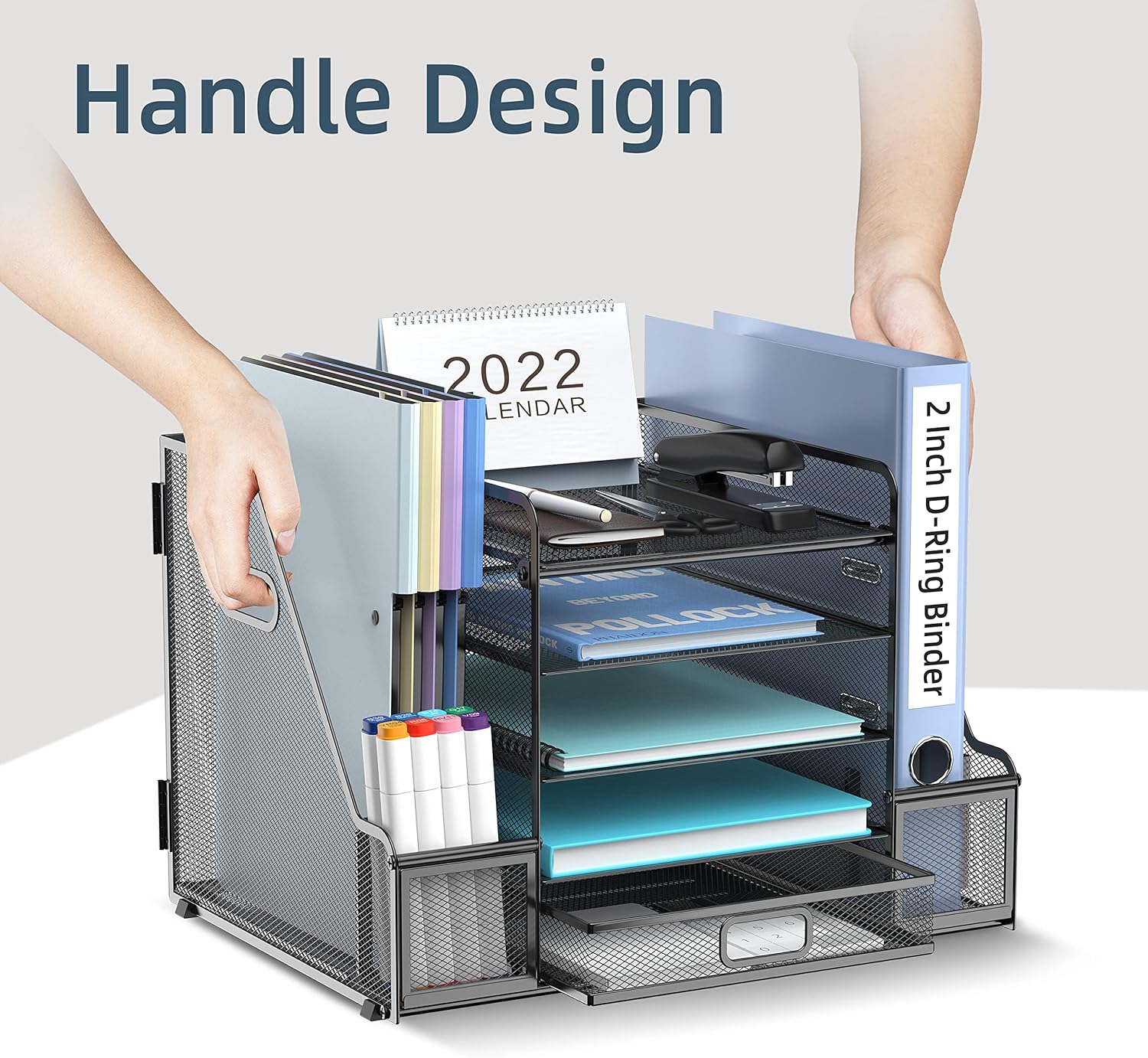 SUPEASY Mesh Desk Organizer with File Holder, 5-Tier Paper Letter Tray Organizer with Magazine Holder, Desktop Organizer and Storage with Drawer for Office Supplies Home or School, Black