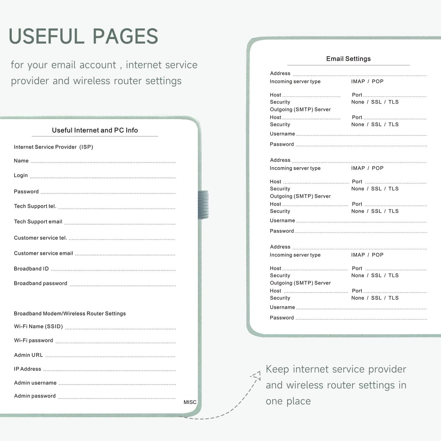 - All-In-One Password Book & More - This password organizer has space to store all the information you may need when you surf the web, including software license information, email settings, wireless router settings, and notes section.