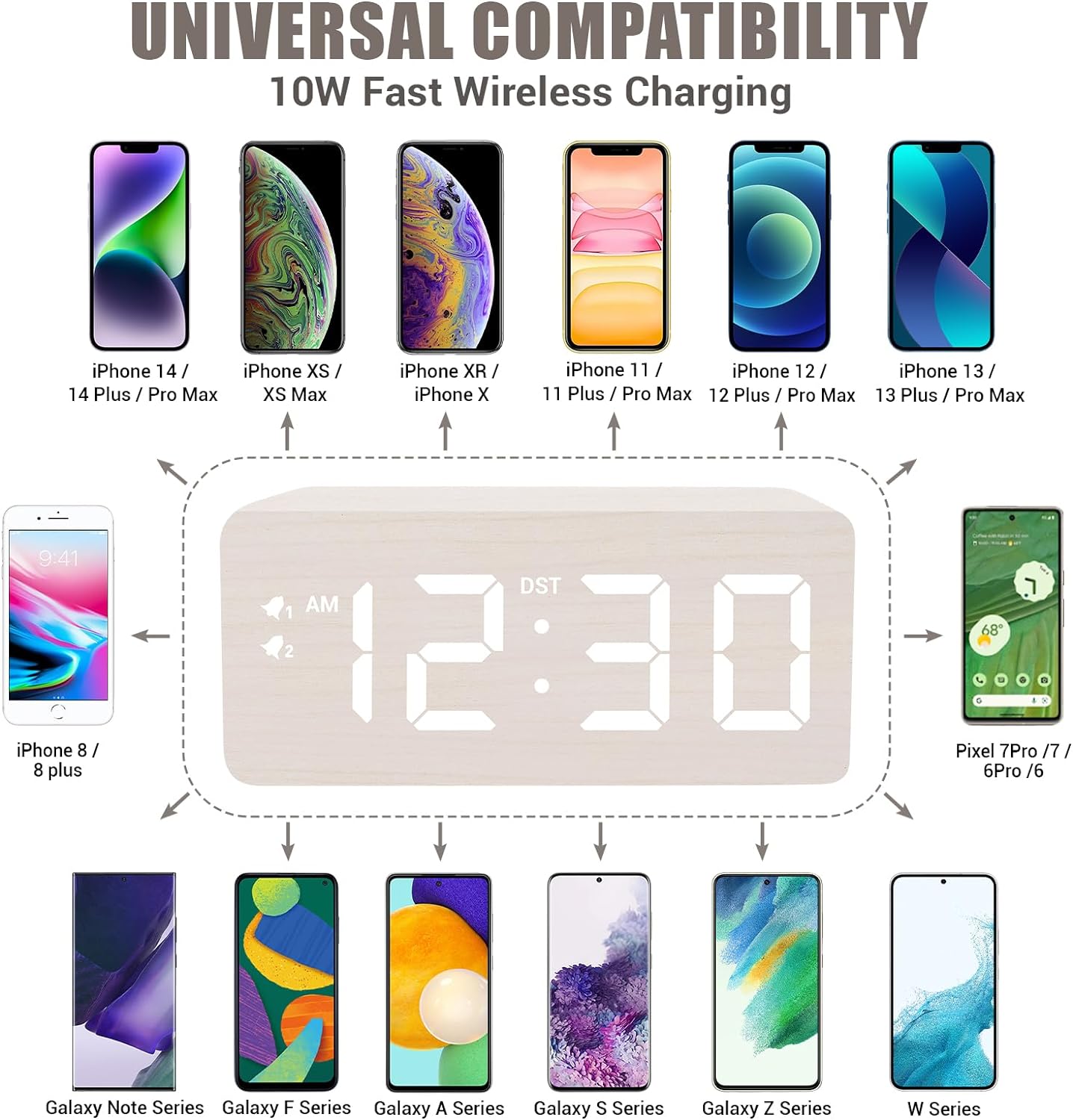 Wooden Digital Alarm Clock, 10W Fast Wireless Charger Station & 2 USB Charging Ports, with 0~99% Dimmer, Dual Alarm, Weekday/Weekend Mode, Wood LED Clock for Bedroom, Desk, Office