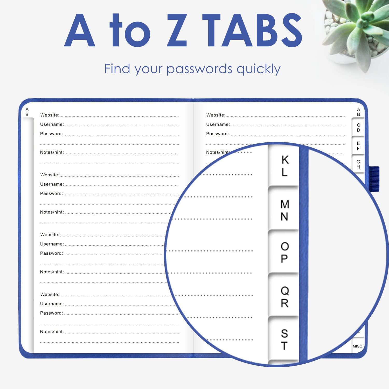 - ALPHABETICAL A-Z TABS FOR QUICK ACCESS: Alphabetical tabs design allows you to store your passwords alphabetically so you can find what you want faster, no more annoying searches!
