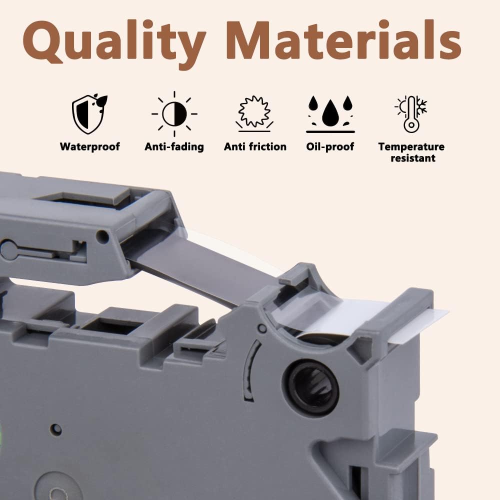 - Product features : Split back, water resistant, fading resistant, abrasion resistant, temperature resistant, strong adhesive. This compatibel label tape 6mm TZe-111 Black on Clear is suitable for indoor and outdoor use