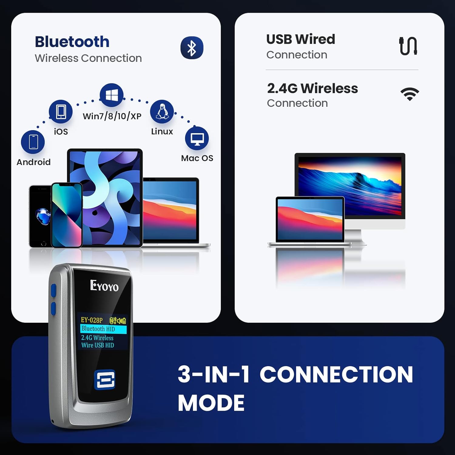 - 3-In-1 Connection: The steady and sustainable Eyoyo scanner can sync with Bluetooth, 2.4G Wireless, and USB Wired connection. It doesn't need difficult programs or configured settings. Just connect the scanner to your phone, tablet, or pc system and the companion scanner will do the rest. The switching between Bluetooth and 2.4G connection mode can be switched directly through the menu without scanning the set code, which is very fast and convenient