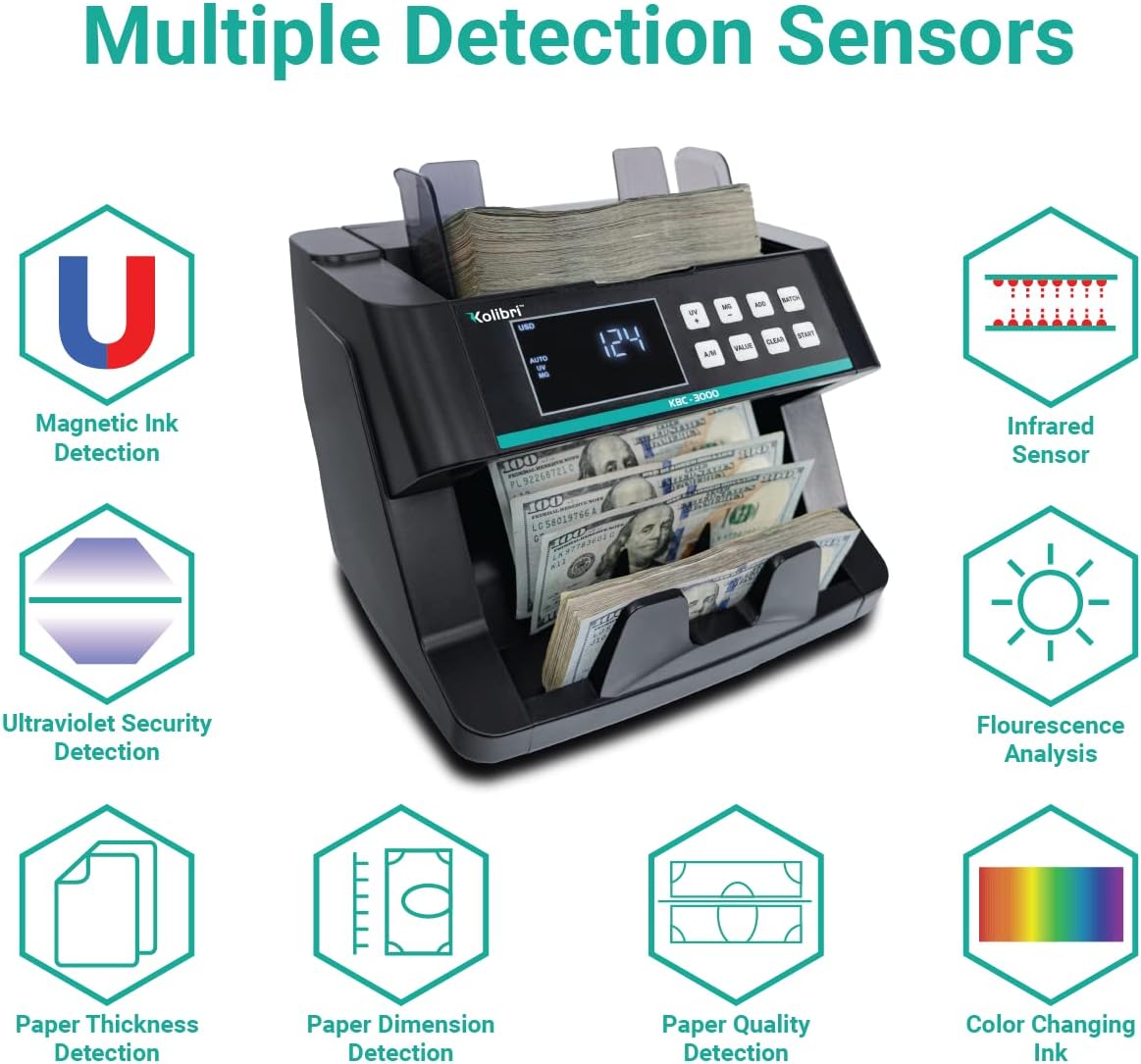 - [EFFICIENT & RELIABLE] Ultraviolet sensors check for the suspect bills and stop counting with a clear alert message if a suspect bill is defected. Infrared detectors ensure that money bills are counted accurately and avoid errors such as chains, double bills, and half notes.