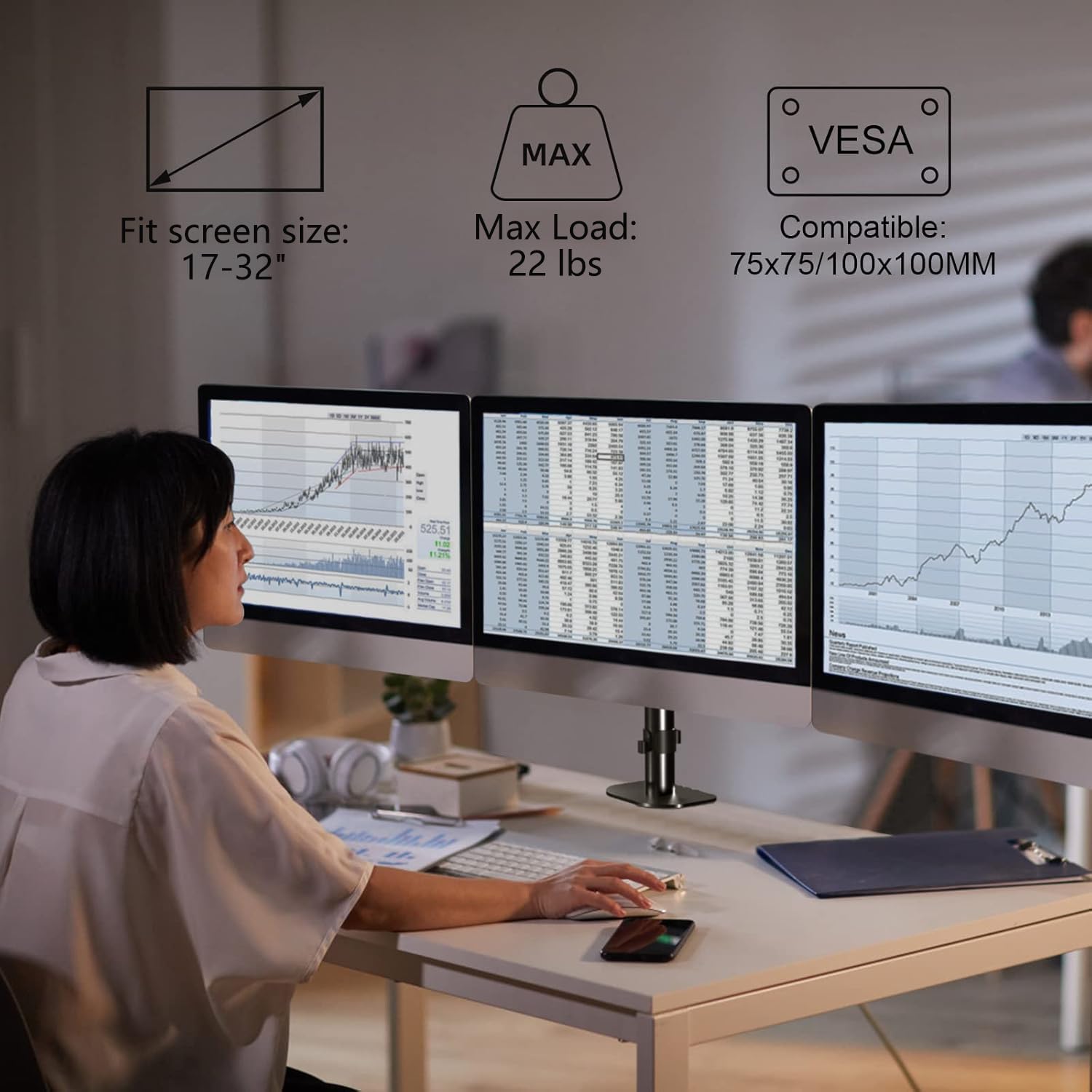 - Ultimate Desk Space Saver: The three monitor mount get displays off your desk conveniently, and the standing pole design helping you to gain a ton of extra space. Integrated cable management to keep cables tucked in arm neatly, hide the sore eyes wire clutter.