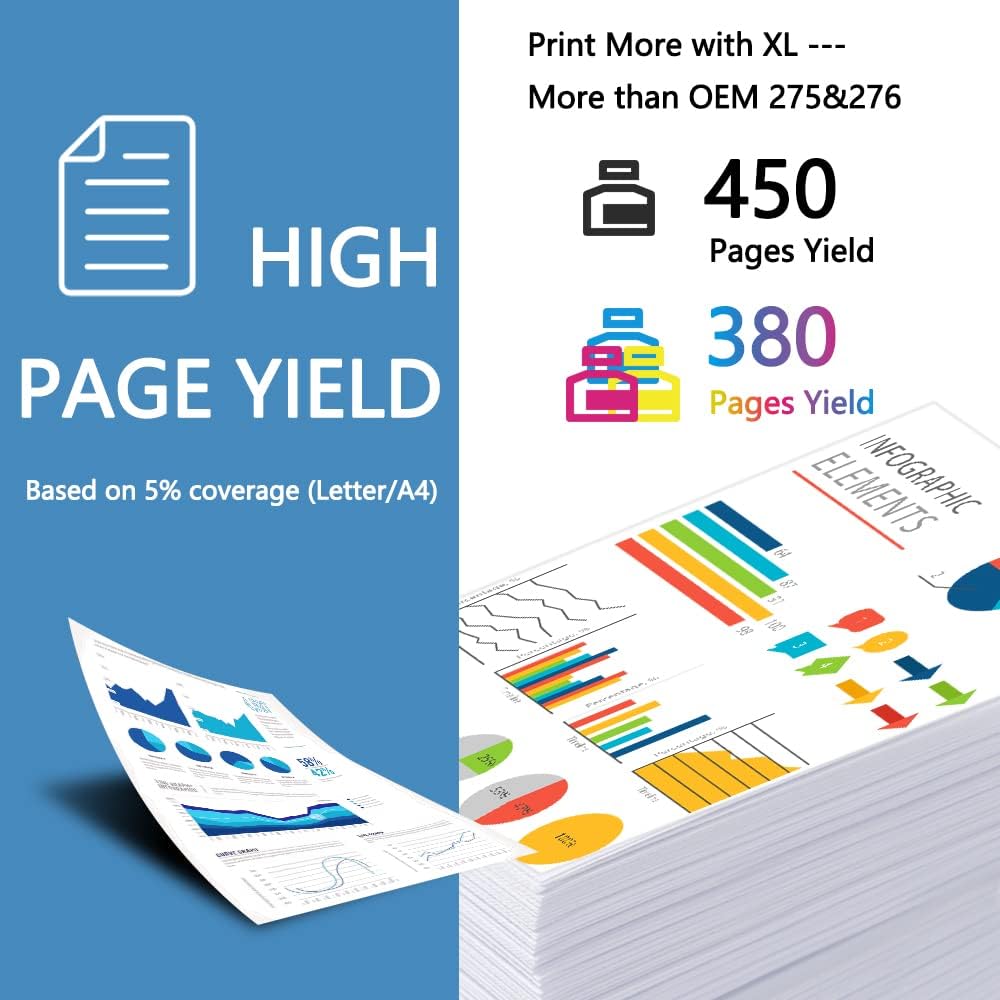 - High Page Yield: Print More with XL --- Up to 450 pages per PG275XL Black, 380 pages per CL276XL color cartridges (Cyan, Magenta, Yellow) (5% coverage)