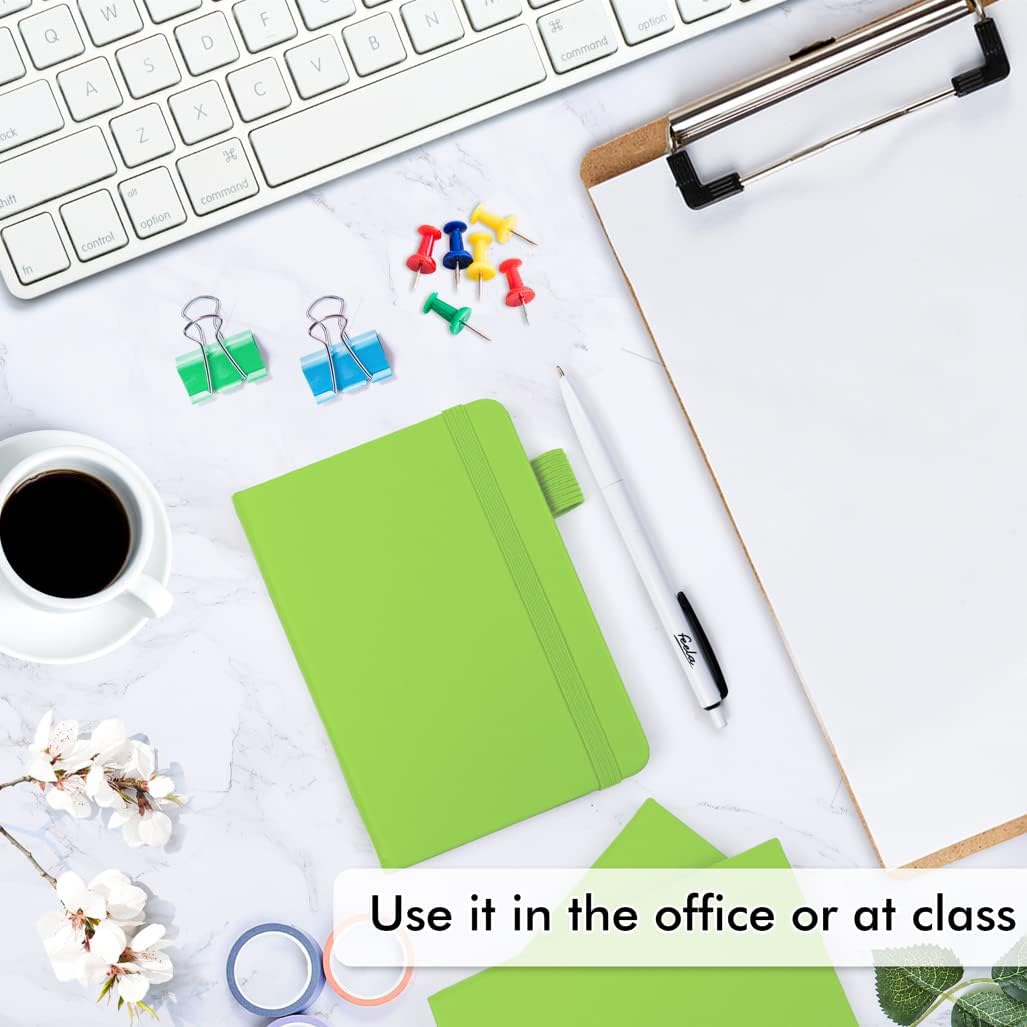 feela 6 Pack Pocket Small Notebooks Bulk, Mini Cute Memo Notepads Hardcover College Ruled Lined Journals with Pen Holder for Women Girls Office School, with 6 Black Pens, 3.5”x 5.5”, A6, Green