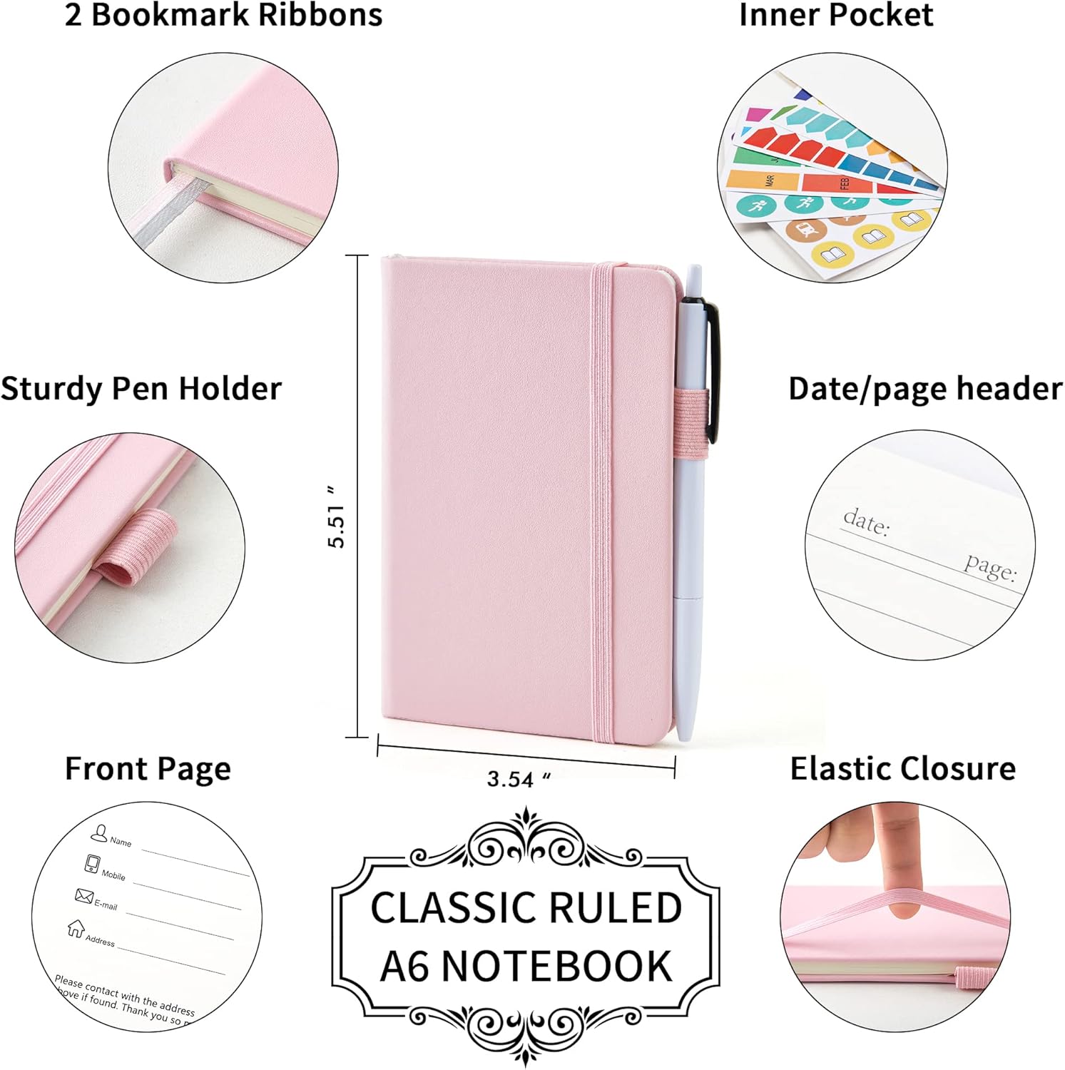 feela 15 Pack Pocket Small Notebooks Bulk, Mini Cute Memo Notepads Hardcover College Ruled Lined Journals with Pen Holder for Women Girls Office School, with 15 Black Pens, 3.5”x 5.5”, A6, Rose Pink