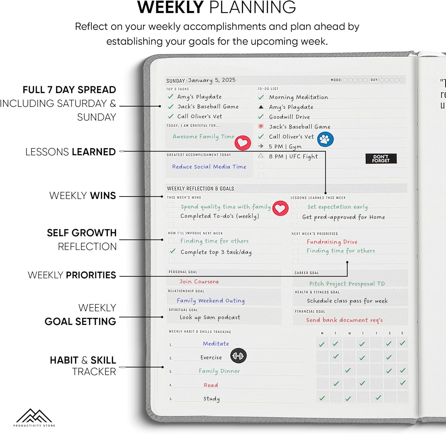 - Undated Weekly Planner with Planner Stickers & Other Bonuses: Use the weekly planner sections to plan ahead each week and reflecting on your weekly performance. This 2025 weekly planner also comes with 5 Bonus features including planner stickers, a habit tracker, weekly inspirational quotes and space for notes.