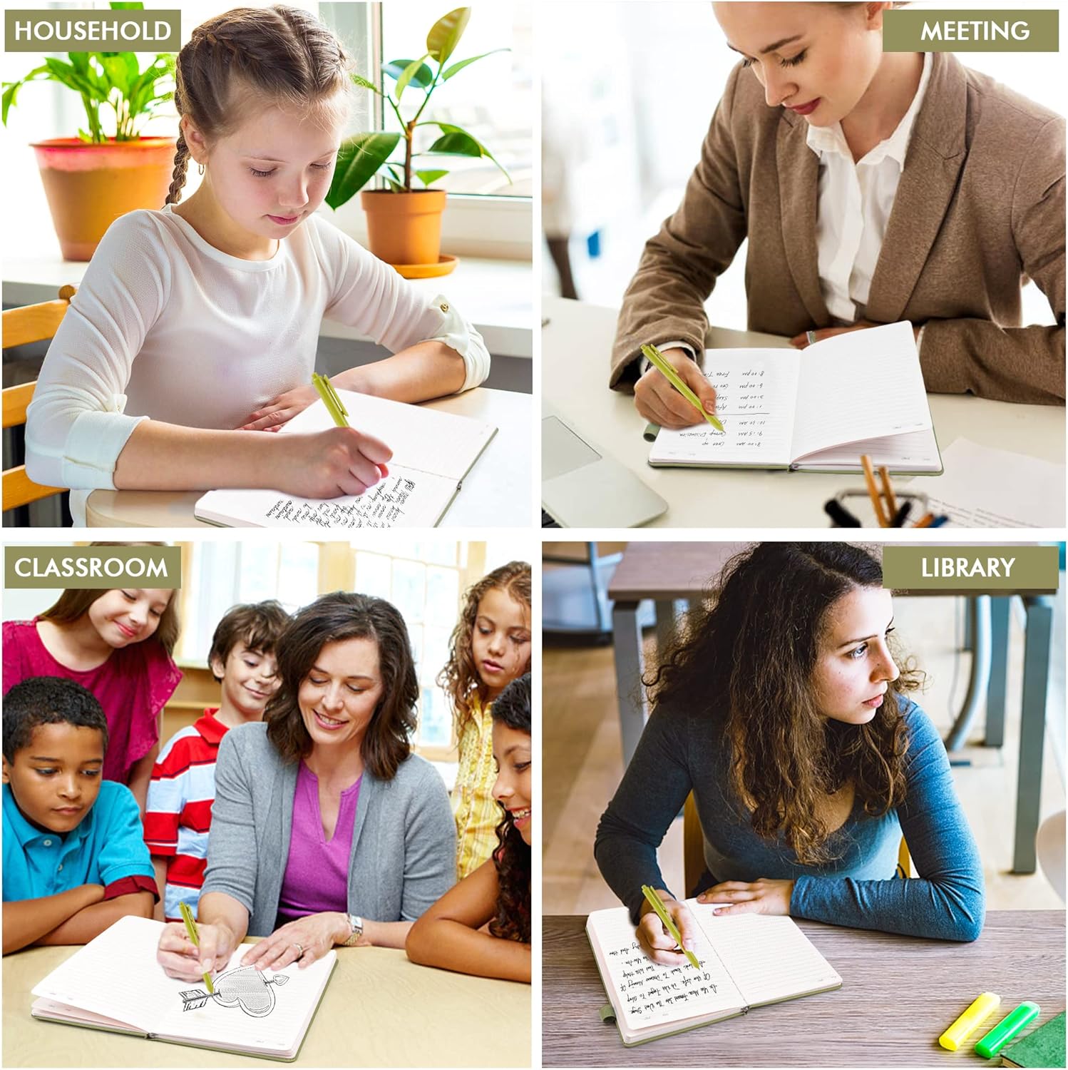- Feela 5 Pack Classic Ruled Notebooks contains 5 Avocado Green ruled sturdy cover notebooks and 5 Black Retractable Pens. Each of the notebooks measures 8.3” x 5.1”, which is perfect to carry and easily held in hand. These black cute pens are customized to be placed in the pen holder, which is pretty convenient.