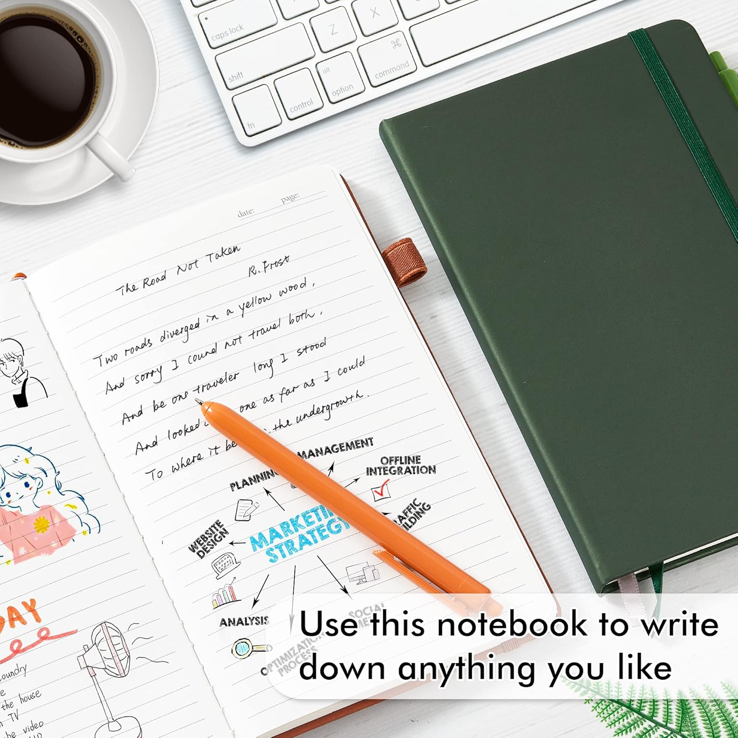 - Feela 5 Pack Classic Ruled Notebooks contains 5 ruled sturdy cover notebooks and 5 Black Retractable Pens. Each of the notebooks measures 8.3” x 5.1”, which is perfect to carry and easily held in hand. These black cute pens are customized to be placed in the pen holder, which is pretty convenient.