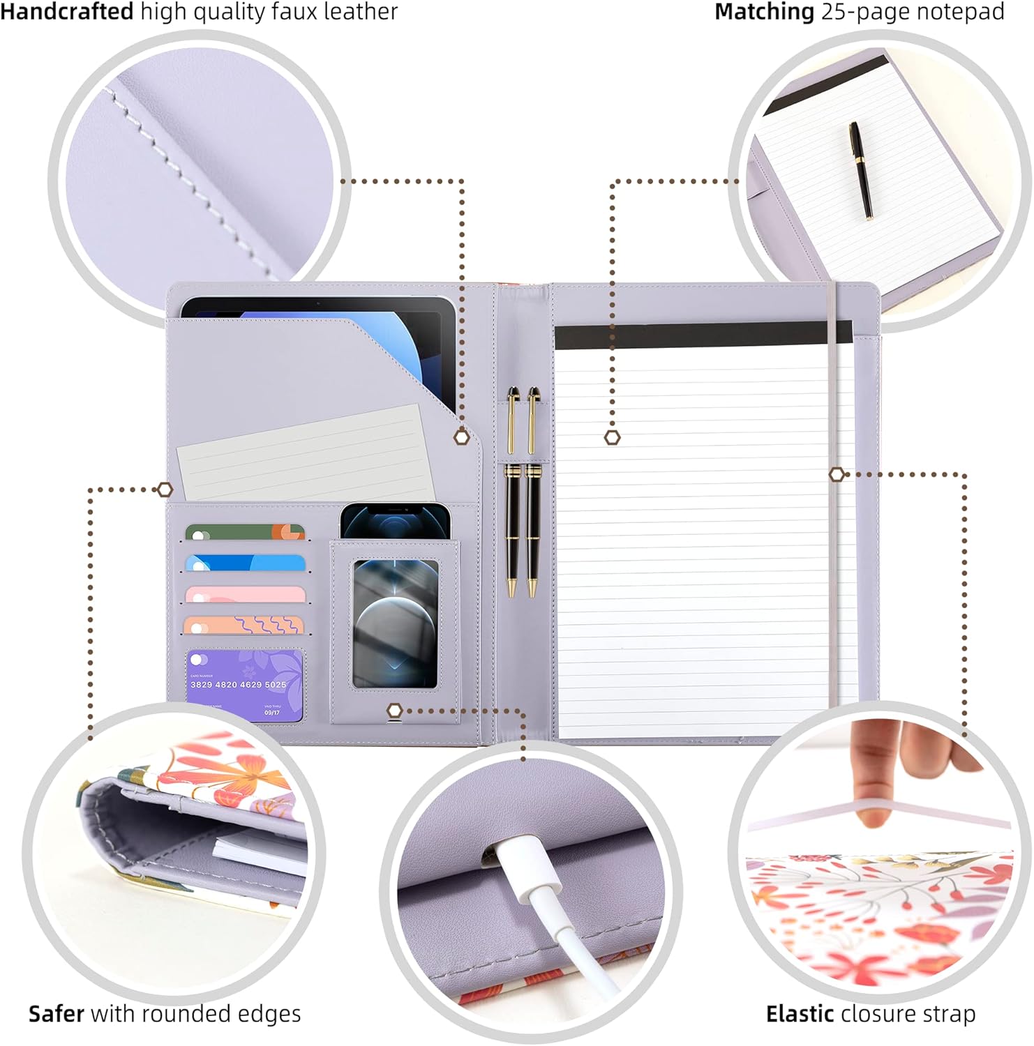 Padfolio for Women PU Leather Portfolio Cute Binder Foldable Recipe Clipboard Purple Phone Pocket