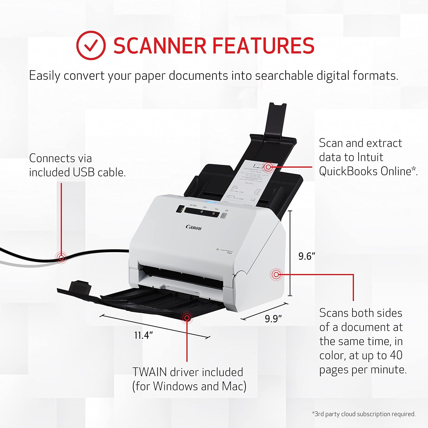- Utilize the included software to quickly scan batches of receipts and invoices to extract contents such as payee, amount, date, etc., and automatically upload information directly to Intuit QuickBooks Online or another third-party cloud service.