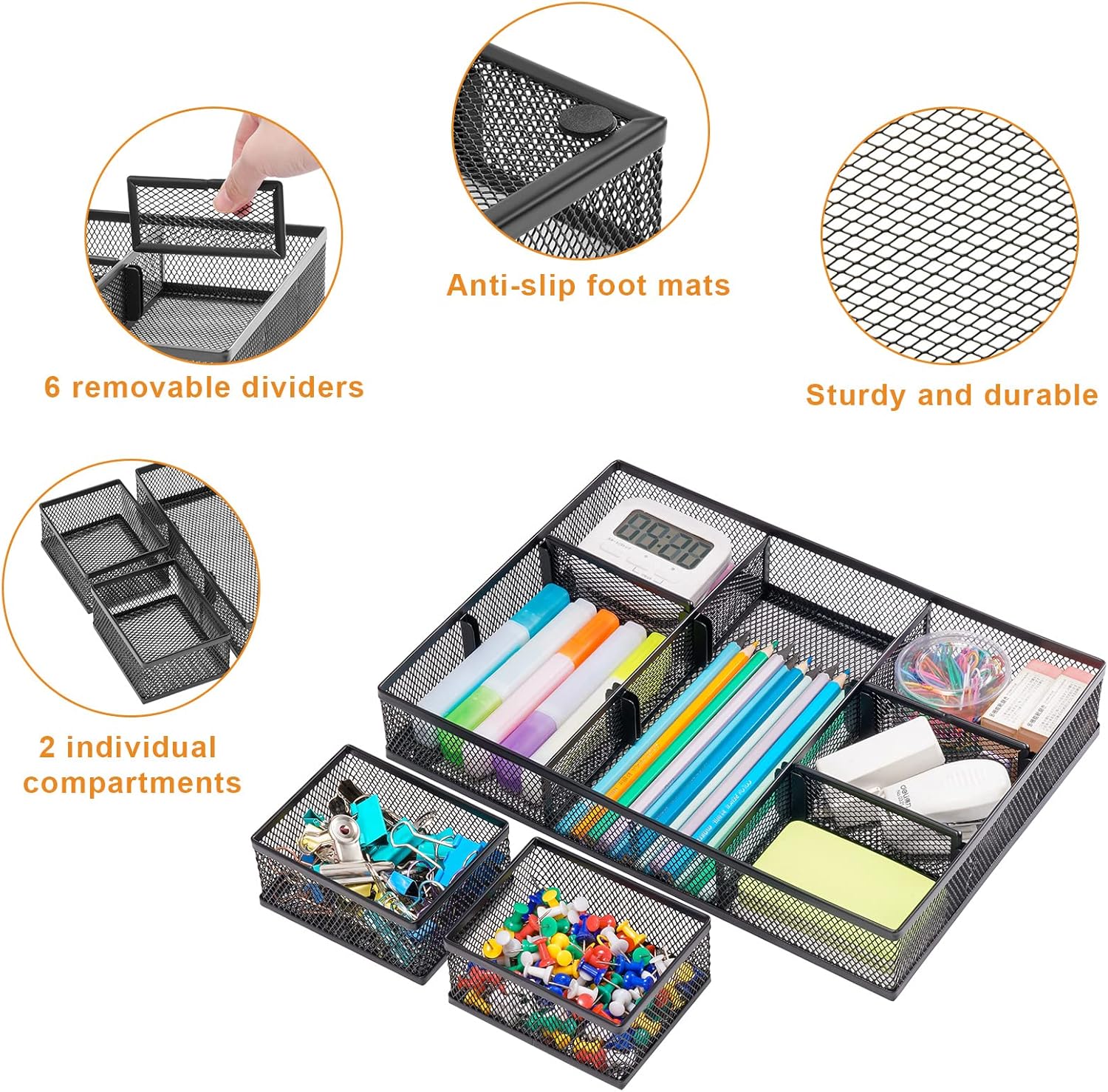 - 【Customizable Compartments Size】The 6 removable dividers can be combined in any size you need to fit different stationery such as pens, erasers, highlighters, notes, staplers, tapes, clips or other supplies.