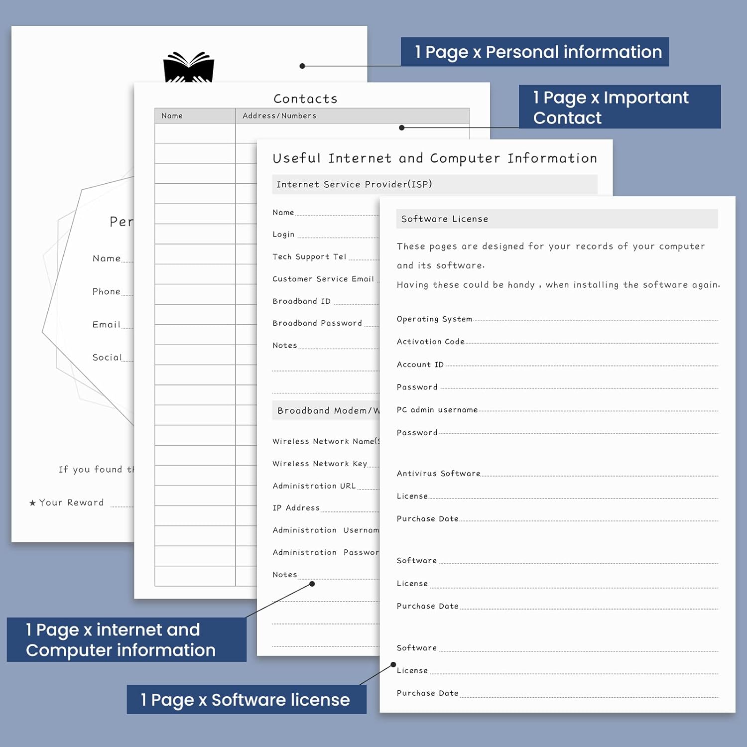 - 【Alphabetical A-Z Tabs】The alphabet label system makes it convenient to record the passwords you need. Logs also have room to write important data, wireless and email settings, software license information, and additional notes. It provides separate pages for your most important websites, so you can access them quickly.