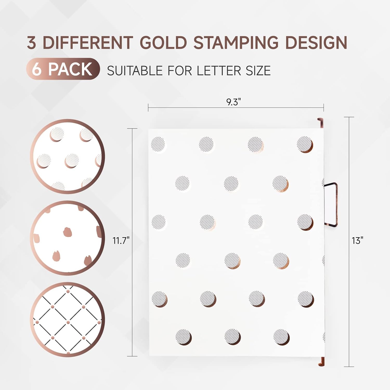 - Folder Dimension - Top metal bar's length is 12.75”, file folder size is 11.7" W x 9.3" H. You will receive 6 folders + 6 customized tabs (3 Gold Foil Design x 2). For any accessory lost, please free to contact us