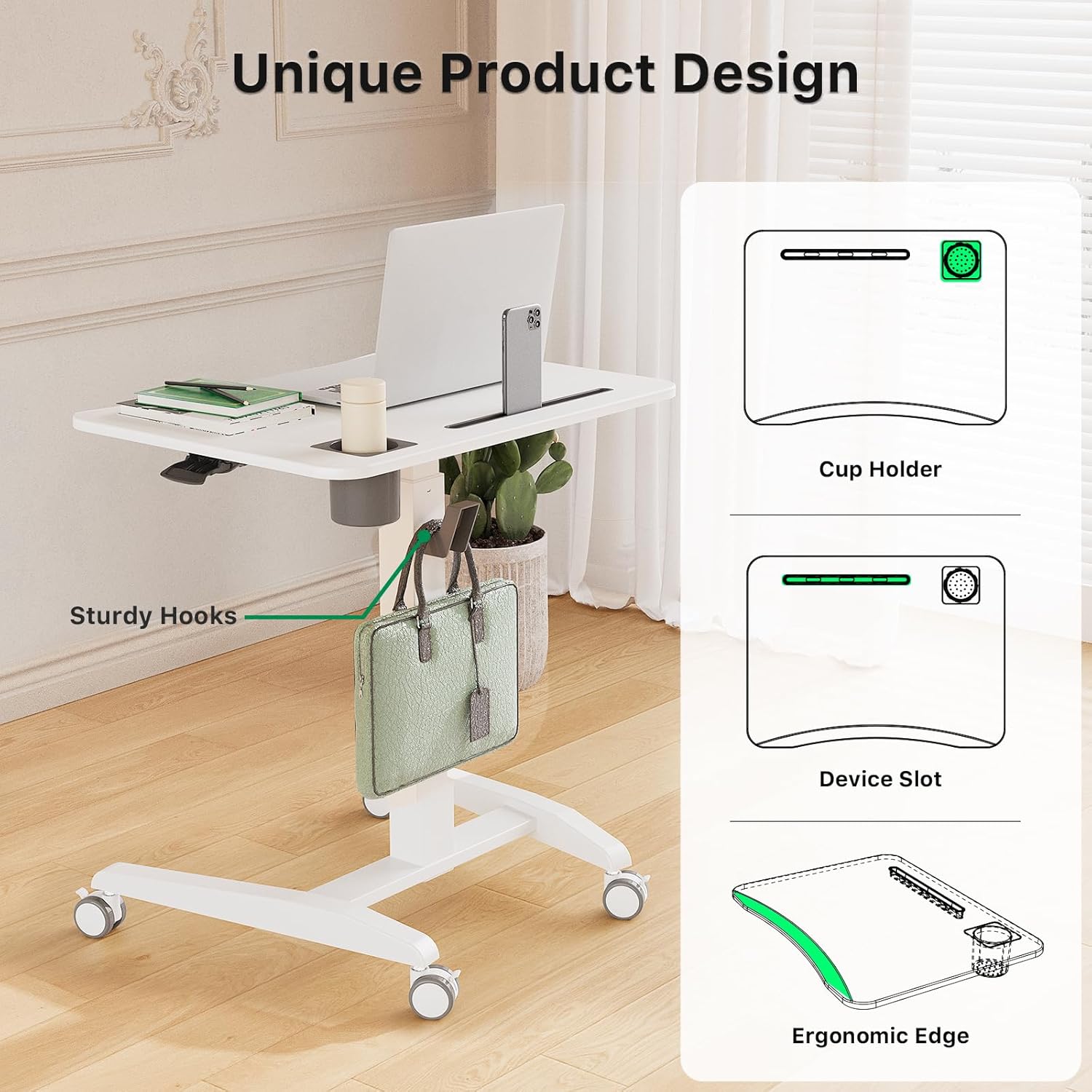 Mobile Standing Desk, Height Adjustable Rolling Laptop Desk, 27 inches Portable Sit Stand Desk with Wheels and Hook, Pneumatic Computer Table, White